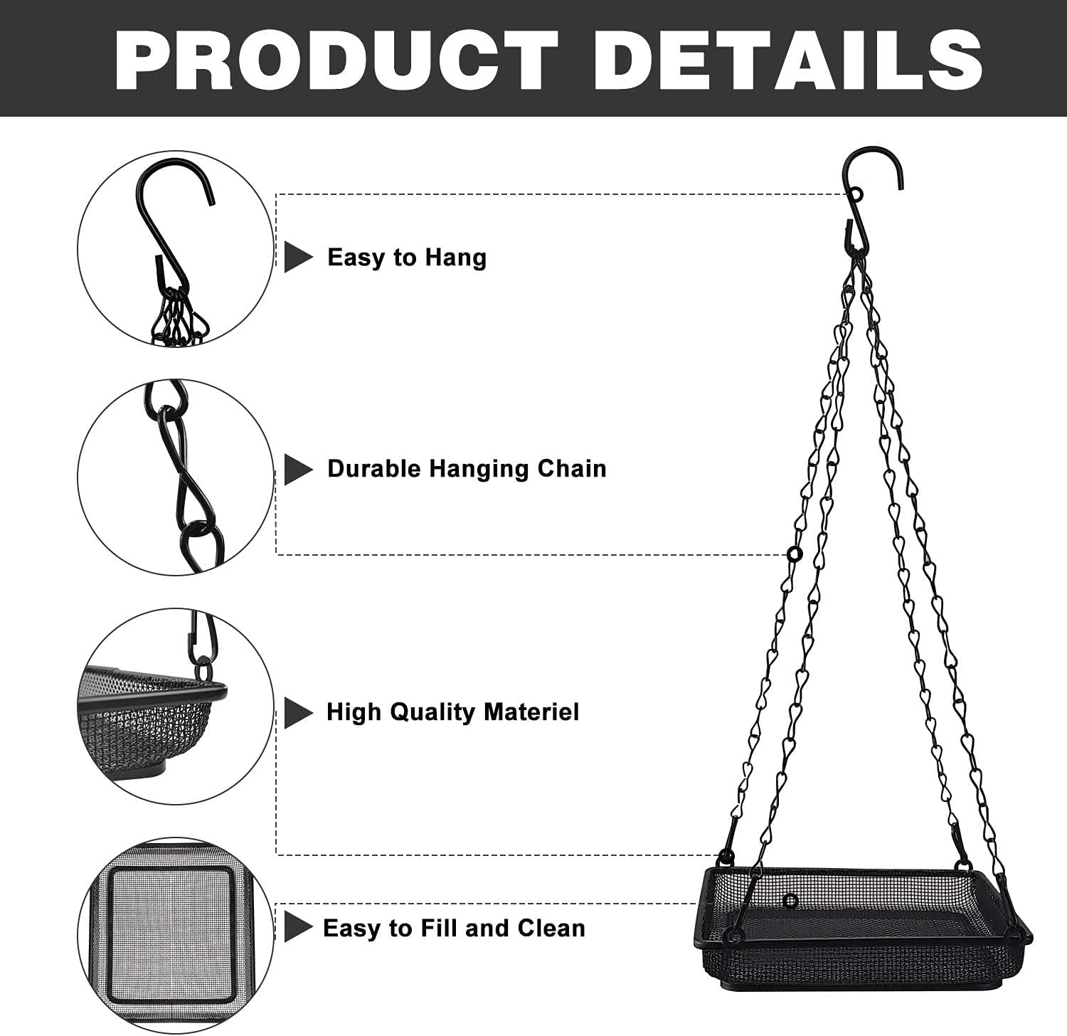 Haltbarkeit und Robustheit: Der hängende Futterspender ist aus Eisen gefertigt, daher winterhart, frostsicher und wetterfest, sodass der hängende Futternapf das ganze Jahr über im Freien von Frühling bis Winter verwendet werden kann