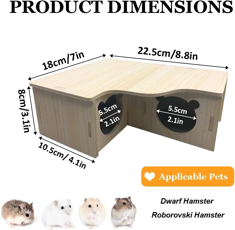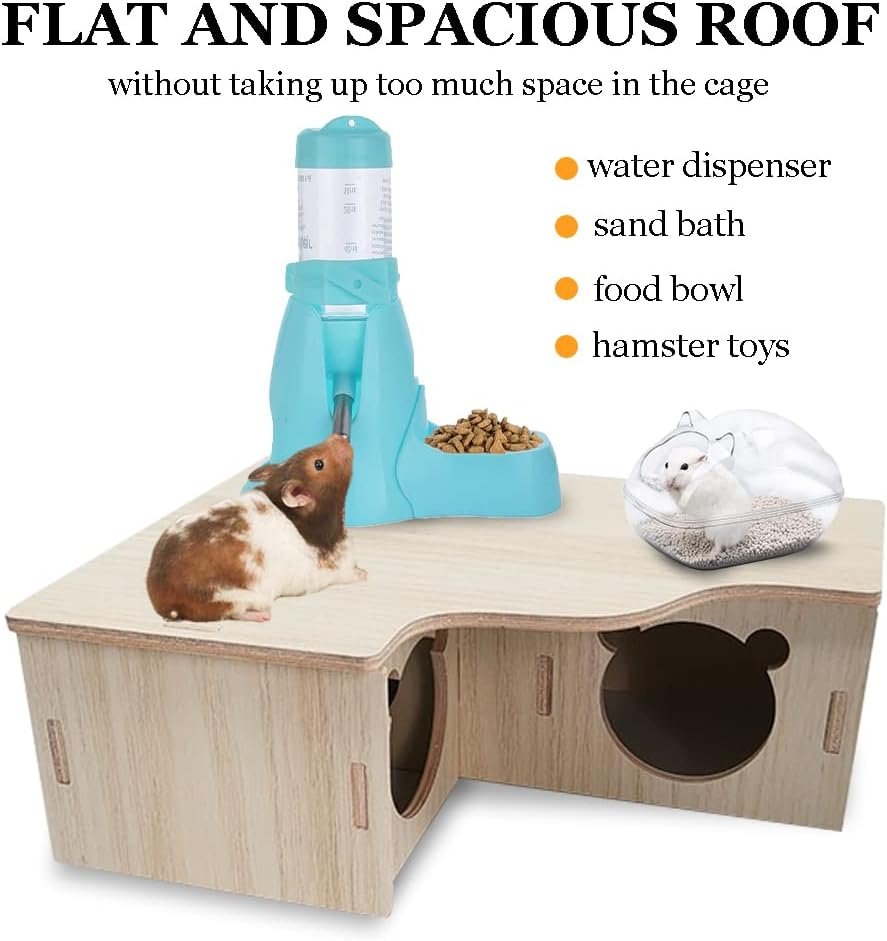 Funktion: Dieses Holzhaus dient dem Hamster als Lebensraum zum Essen, Schlafen und Spielen, um überschüssige Energie zu verbrauchen und ihn aktiv und gesund zu halten. Darüber hinaus ist das flache, geräumige Dach groß genug, um einen Hamsterwasserspender, ein Sandbad oder anderes Spielzeug unterzubringen, ohne zu viel Platz im Käfig einzunehmen.