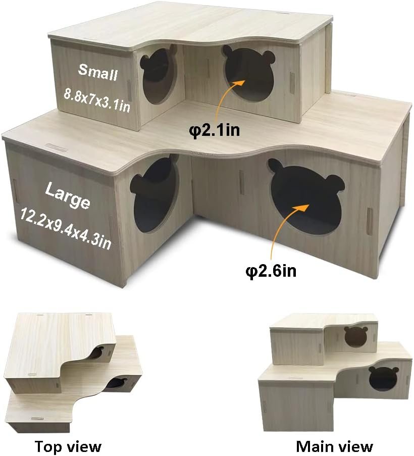 3-Kammer-Design: Dieses Holzhaus verfügt über drei Kammern, die durch vier Löcher mit einem Durchmesser von etwa 2,6 Zoll (6,7 cm) verbunden sind, in denen Ihr kleiner Liebling hin und her gehen kann, was den Spielspaß erhöht.