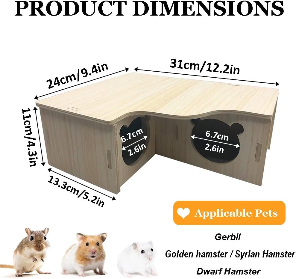 Funktion: Dieses Holzhaus dient dem Hamster als Lebensraum zum Essen, Schlafen und Spielen, um überschüssige Energie zu verbrauchen und ihn aktiv und gesund zu halten. Darüber hinaus ist das flache, geräumige Dach groß genug, um einen Hamsterwasserspender, ein Sandbad oder anderes Spielzeug unterzubringen, ohne zu viel Platz im Käfig einzunehmen.