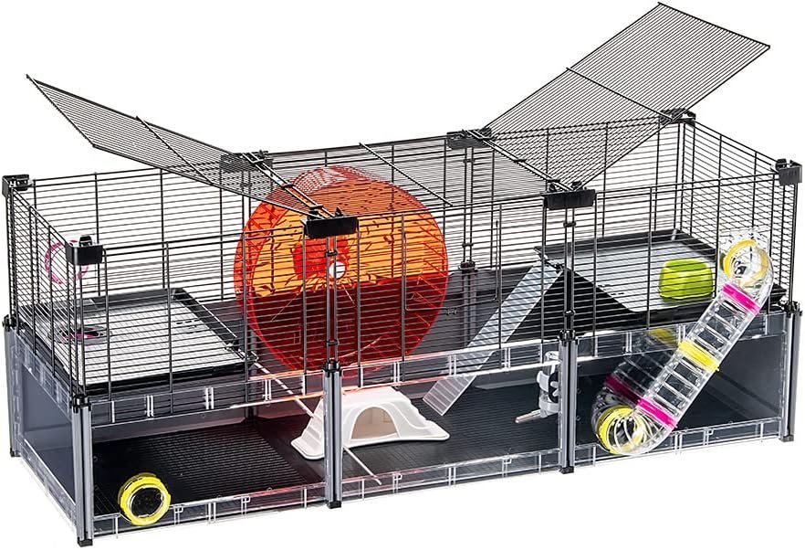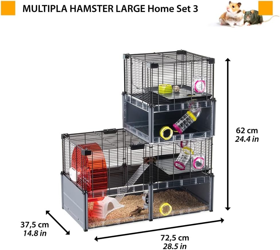 Gesamtaußenmaße: 107,5 x 37,5 x 42 cm. Große Stellfläche: 0,52 qm. Im Lieferumfang enthaltenes Zubehör: 75-ml-Wasserflasche, 65-ml-Napf, Hamsterhaus, Laufrad und Tunnel, Boden mit Leitern.