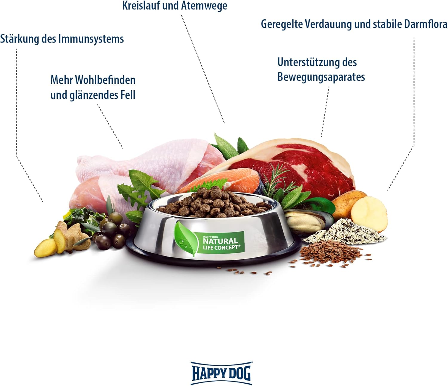 Unser Versprechen – Happy Dog Produkte sind ohne den Zusatz von künstlichen Farb-, Geschmacks- und Konservierungsstoffen sowie Soja- und Zuckerzusätzen. Sie werden ohne Tierversuche und Gentechnik entwickelt.