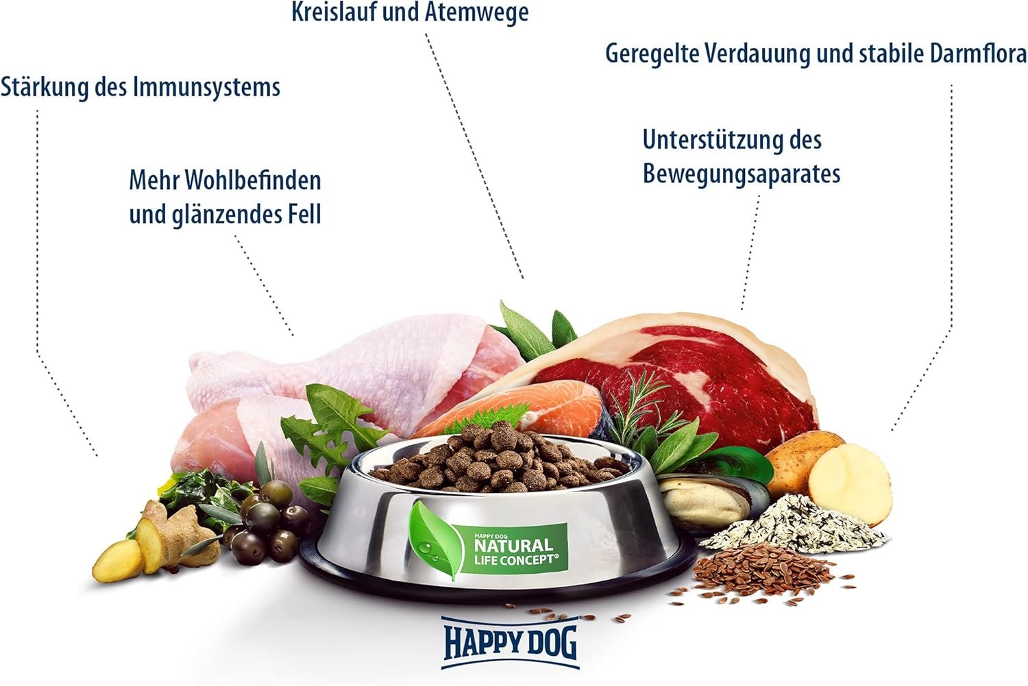 Unser Versprechen – Happy Dog Produkte sind ohne den Zusatz von künstlichen Farb-, Geschmacks- und Konservierungsstoffen sowie Soja- und Zuckerzusätzen. Sie werden ohne Tierversuche und Gentechnik entwickelt