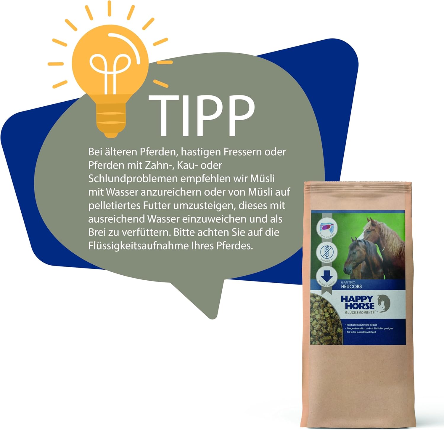 „Gastro Heucobs“ bestehen aus erlesenen Gräsern und wertvollen Wiesenkräutern, die nach der Ernte bei niedrigen Temperaturen schonend getrocknet werden, sodass die wertvollen Nähr- und Vitalstoffe vollständig erhalten bleiben. Ein wesentliches Merkmal der „Heucobs“ ist ihre kurze und effektive Einweichzeit. Aus diesem Grund sind sie eine echte Alternative zu gewöhnlichen Heucobs. Ihre Verwendung ist besonders für zu dünne, schwere Pferde und ältere Pferde mit Zahnproblemen geeignet. Darüber hinaus ist die Beigabe zum Grundfutter (ca. 1 kg pro 100 kg Körpergewicht/Tag) oder zur Ergänzung des Grundfutters (1 kg Heukolben ersetzen 1,2 kg Heu) möglich. Bei Bedarf kann 1 kg Heucobs mit 2-3 Liter Wasser eingeweicht werden. Futter für Pferde Große Auswahl an Gräsern und Kräutern von regionalen Wiesen Zutaten: Rohprotein 11,30 % Rohfett 2,30 % Rohfaser 21,40 % Rohasche 10,40 % Kalzium 0,90 % Phosphor 0,30 % Magnesium 0,28 % Natrium 0,0,10 % Sternzucker 8,30 % Fruktan…..5,90 % roh verdaulich Eiweiß…..81 g/kg verdauliche Energie…..7,9 MJ DE/kg einwandfreie Energie…..6,6 MJ ME/kg Nativer Gehalt an Spurenelementen durchschnittlich pro kg: Zink…..40mg Mangan….. 100mg Kupfer…..6mg Selen…..0,03 mg Fütterungsempfehlung: (1 Liter entspricht ca. 530 g) Als Alternative zum Grundfutter: ca. 1 kg pro 100 kg Körpergewicht täglich. Um das Grundfutter zu verstärken, passen Sie die Menge des Grundfutters an. 1 kg Gastro Heucobs ersetzt 1,2 kg Heu. Bei Bedarf 1 kg mit 1,5 – 3 Liter Wasser einweichen.