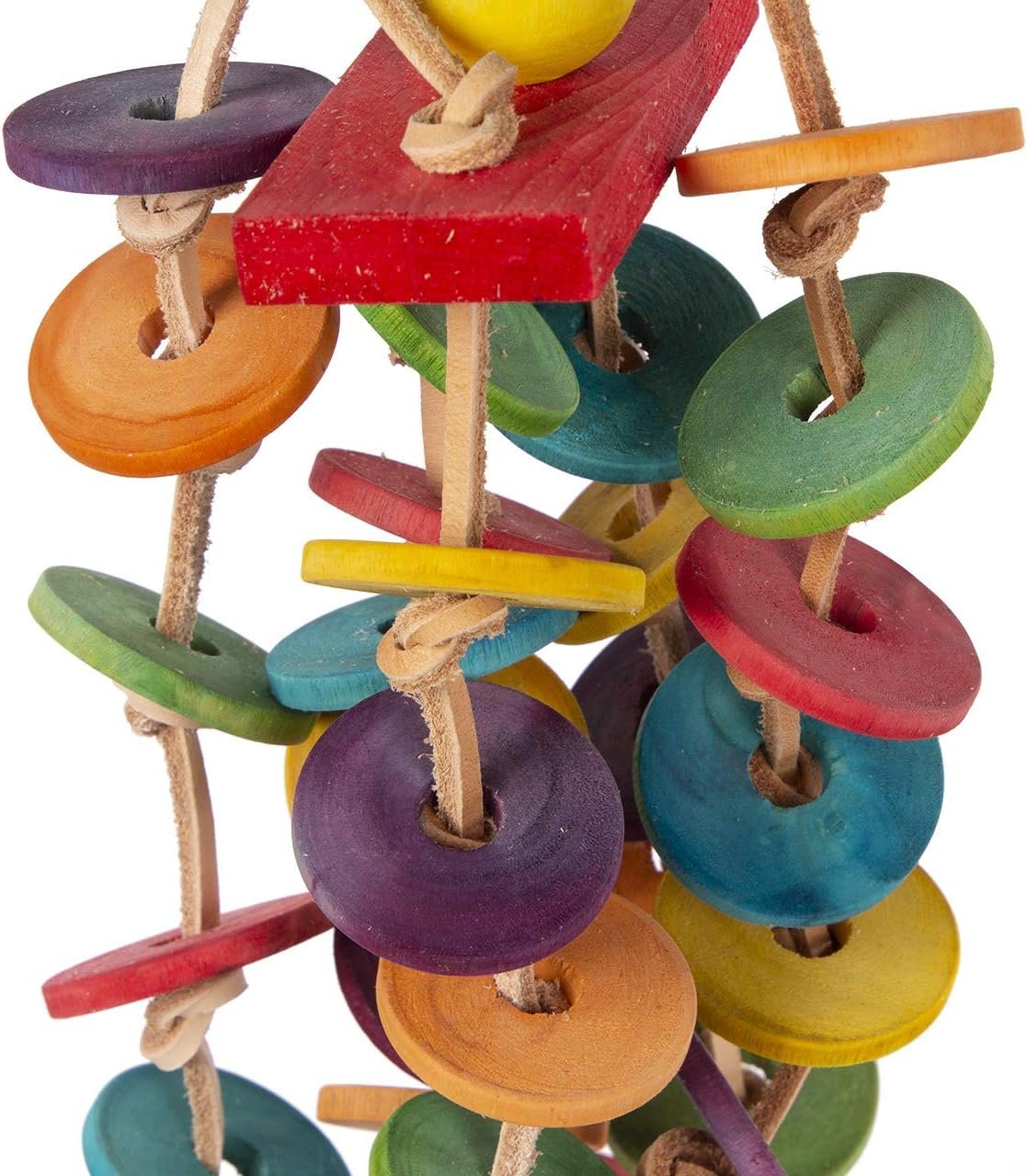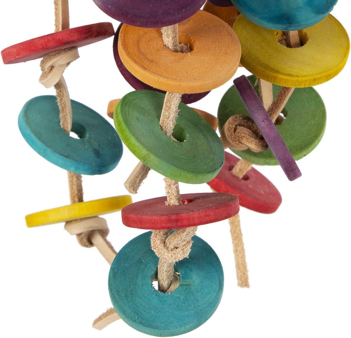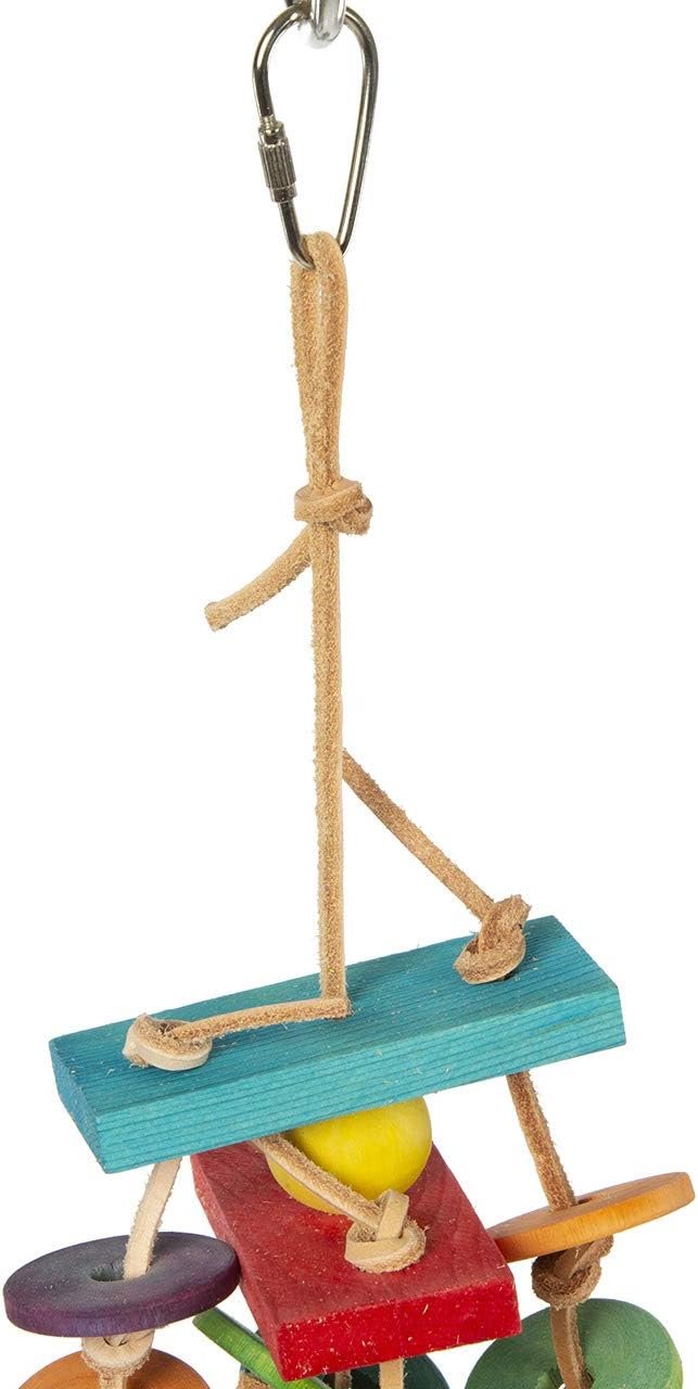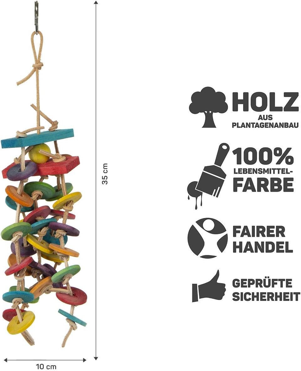 Absoluter Knabberspaß aus Leder und Holz. Bunte Holzklötze und Taler hängen an einzelnen Lederbändern herab und wackeln spielerisch vor Dir her.