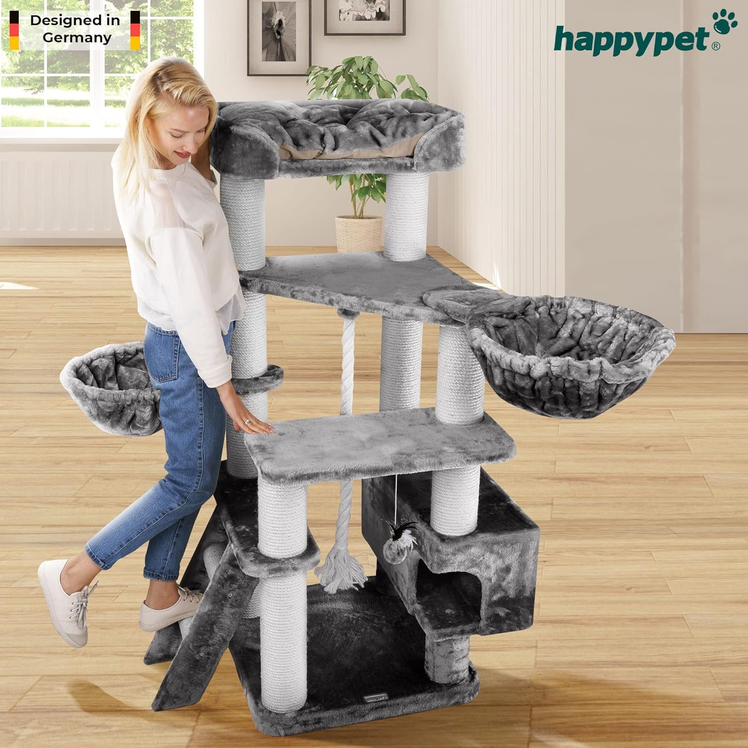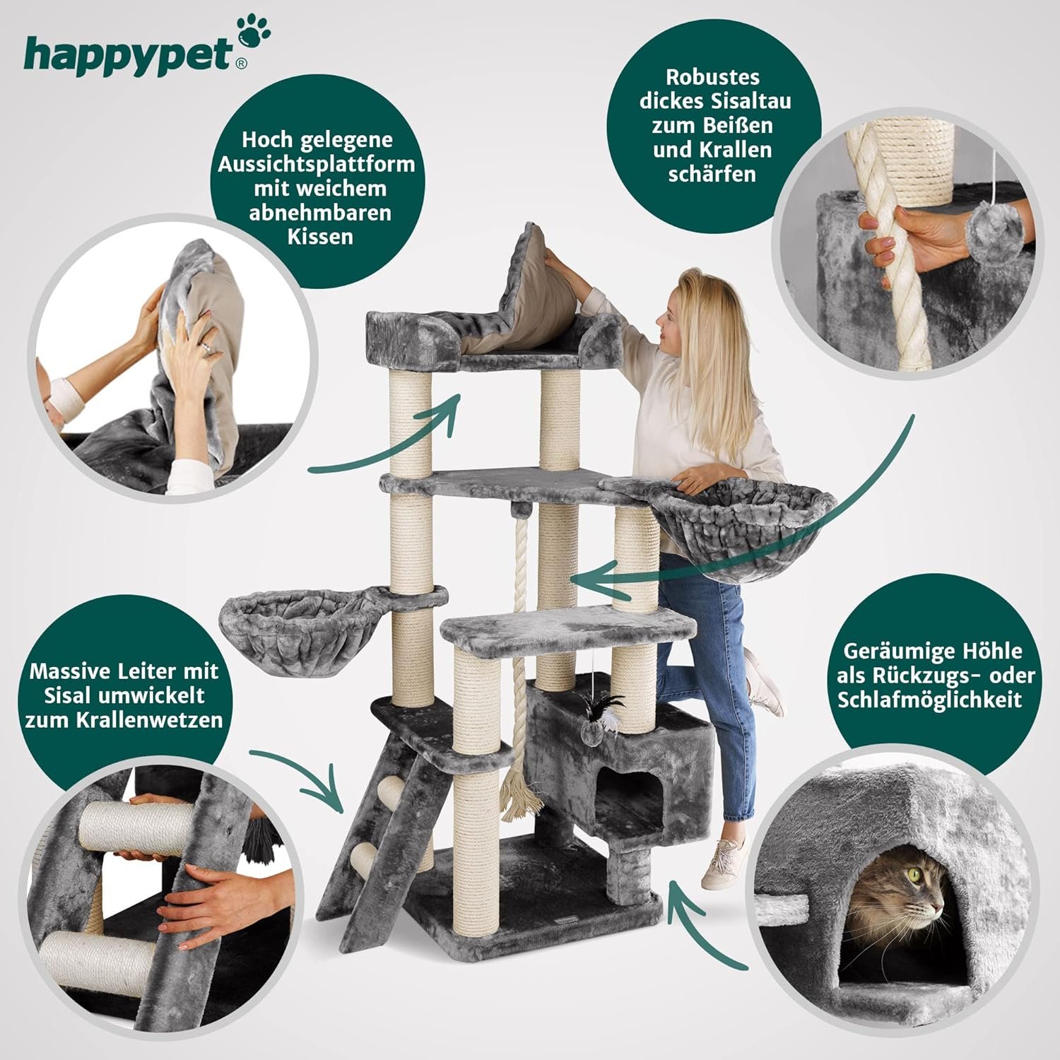 Hochwertige Materialien: Ein hochwertiger Plüschbezug mit einer Dichte von 600 g/m² ist langlebig und nahezu fusselfrei. Dickes Natursisal mit einem Durchmesser von 8 mm umhüllt die Stämme und sorgt für eine langanhaltende Nutzung und optimale Krallenpflege.