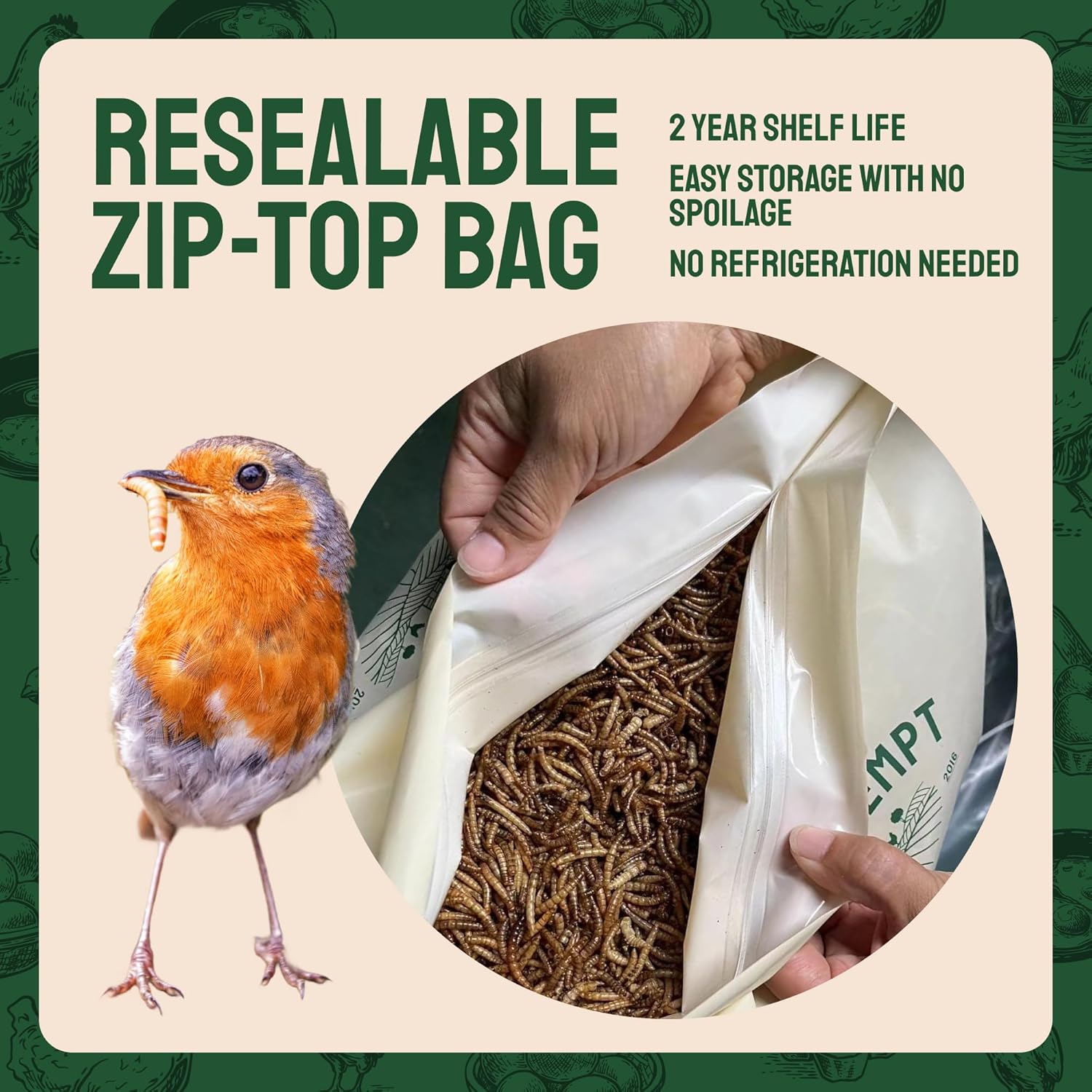 LANGANHALTENDE FRISCHE: Unser Hühnerfutter und Igelfutter wird in einem wiederverschließbaren Zip-Beutel geliefert, der die Frische bewahrt. Leicht zu lagern, kein Kühlschrank erforderlich. Es war noch nie einfacher, Ihren Schwarm zu füttern und Ihren Garten zu pflegen.