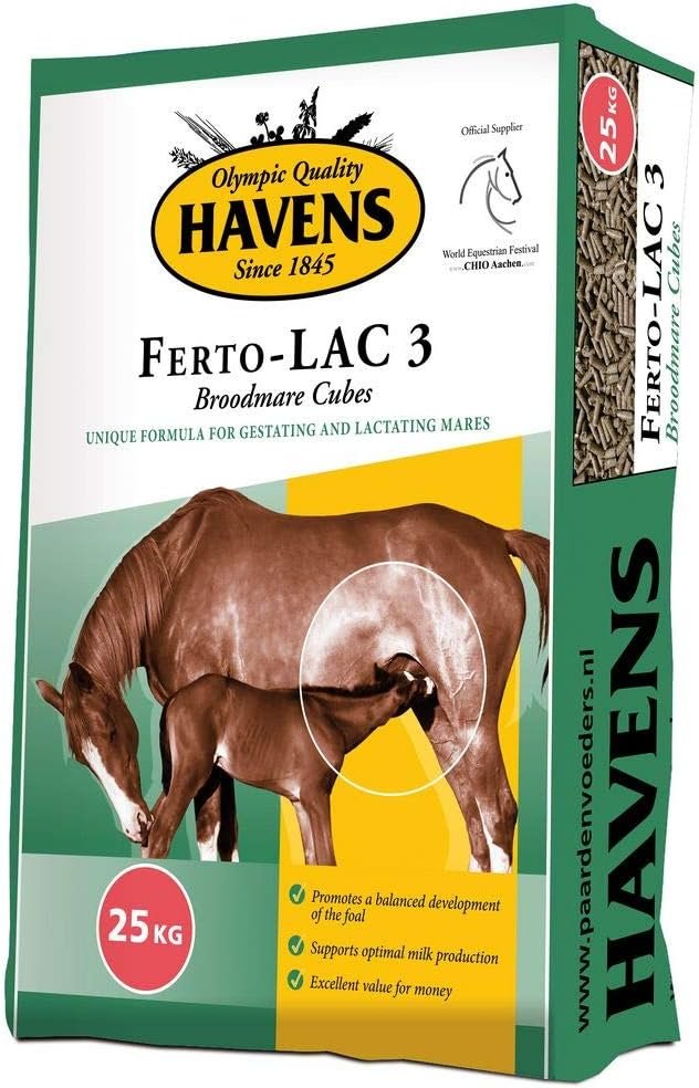 Tragende und säugende Stuten müssen sich nicht nur selbst ernähren, sondern tragen auch die Verantwortung für die anfängliche Entwicklung des Fohlens. Daher ist die richtige Ernährung in dieser Zeit besonders wichtig. Ferto-LAC 3 (7 mm Pellet) ist ein Alleinfuttermittel und deckt daher nicht nur den Bedarf der Stute, sondern auch den des ungeborenen Fohlens. Ferto-LAC 3 ist ein hervorragendes Zuchtfutter mit besonders hochwertigen Proteinen und essentiellen Vitaminen und Mineralstoffen, speziell abgestimmt auf die spezifischen Ernährungsbedürfnisse von Zuchtstuten im letzten Trächtigkeitstrimester und während der Laktation. Mit Multi-Calcium-Komplex, extra Kupfer und extra Aminosäuren zur Unterstützung eines optimalen Knochenwachstums und einer gleichmäßigen Entwicklung des Fohlens. Erhöhter Energie- und Proteingehalt für optimale Milchleistung und gleichmäßiges Fohlenwachstum