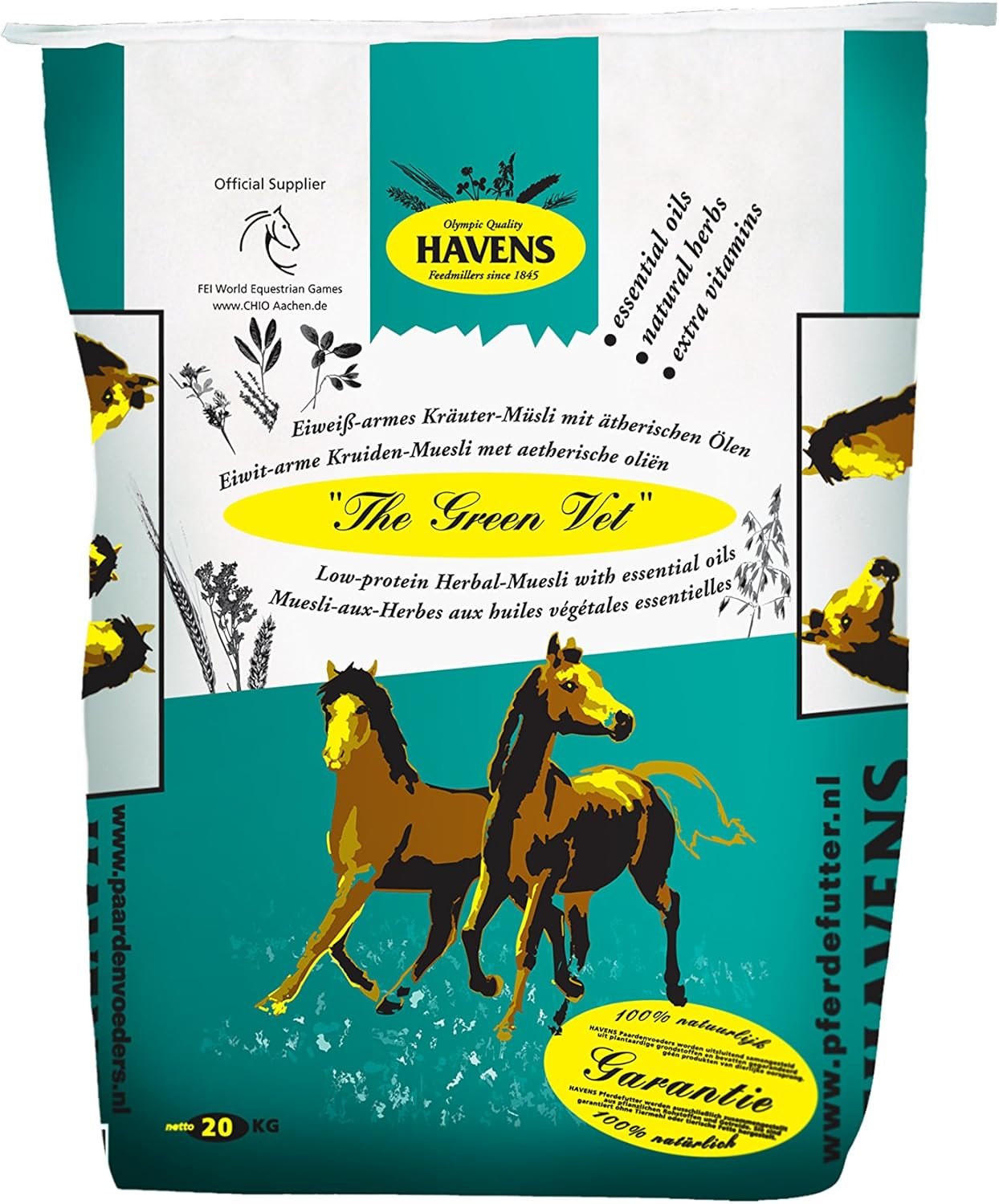 Ein natürliches Müsli aus hydrothermisch aufgeschlossenen Getreidebestandteilen (u.a. Gerste, Weizen, Mais, Hafer), Karottenflocken, Johannisbrot und Luzerne, verfeinert mit einer Mischung aus natürlichen Kräutern und ätherischen Ölen. Der aromatisch duftende Green Vet enthält eine luxuriöse Kräutermischung aus Eukalyptus, Pfefferminze, Thymian, Majoran und Basilikum. Ideal als alleiniges Kraftfutter oder als Ergänzung zur bestehenden Futterration, aber auch als „Leckerli“ oder als Belohnung! Sehr gut für Pferde im Sport oder in geringerer Dosierung auch für Freizeitpferde geeignet. Niedriger Proteingehalt. Enthält hydrothermisch aufgeschlossenes Getreide für eine optimale Verdaulichkeit. Vielseitige und sehr schmackhafte Komposition. Reich an allen notwendigen Vitaminen, Mineralien und Spurenelementen zur Unterstützung des Immunsystems und der Gesundheit. Staubfrei und mit extra Kräutern; wohltuend für die Atemwege