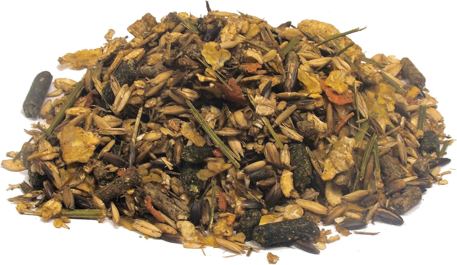 Natürliches, proteinarmes Getreide auf Basis von Getreideflocken, Luzerne und Karottenflocken, ergänzt mit natürlichen Kräutern und ätherischen Ölen
