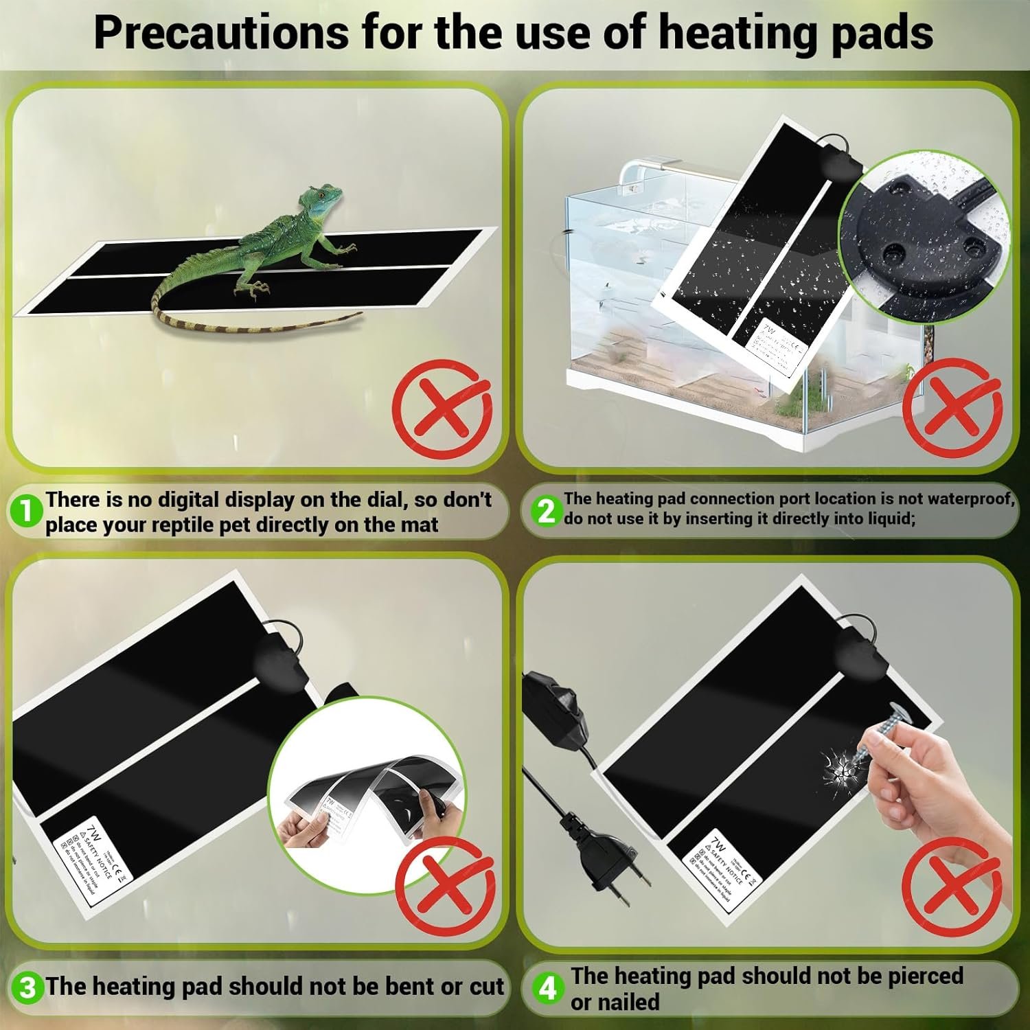 Hinweis zu Terrarium-Heizmatten: 1. Pflanzen-Heizmatte. Keine digitale Anzeigefunktion am Zifferblatt, bitte legen Sie Ihr krabbelndes Haustier nicht direkt auf das Heizkissen; 2. Die Reptilien-Heizmatte ist nicht wasserdicht. Bitte legen Sie sie nicht direkt in Flüssigkeit, um sie zu verwenden. 3. Terrarien-Heizmatten können nicht gebogen oder geschnitten werden. 4. Die Heizmatte für Terrarien kann nicht gebohrt oder genagelt werden