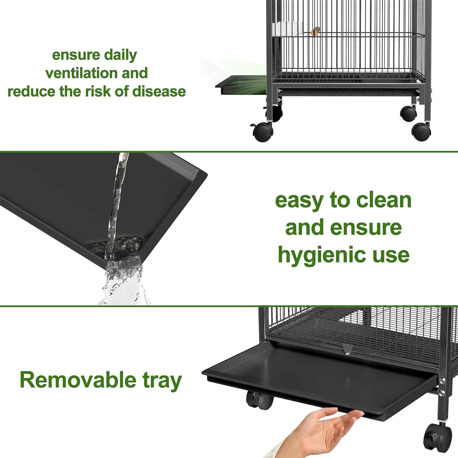 REINIGUNG UND KOMFORT MIT EINEM TOUCH: Die herausnehmbare Metallschublade ist leicht zu reinigen, die Metallschublade an der Unterseite lässt sich leicht verschieben und herausnehmen, mit Wasser abspülen oder mit einem feuchten Tuch abwischen, sie kann schnell wieder gereinigt werden, einfach die innere Hygiene des Vogelkäfigs aufrechtzuerhalten und die Gesundheit des Papageis zu schützen.