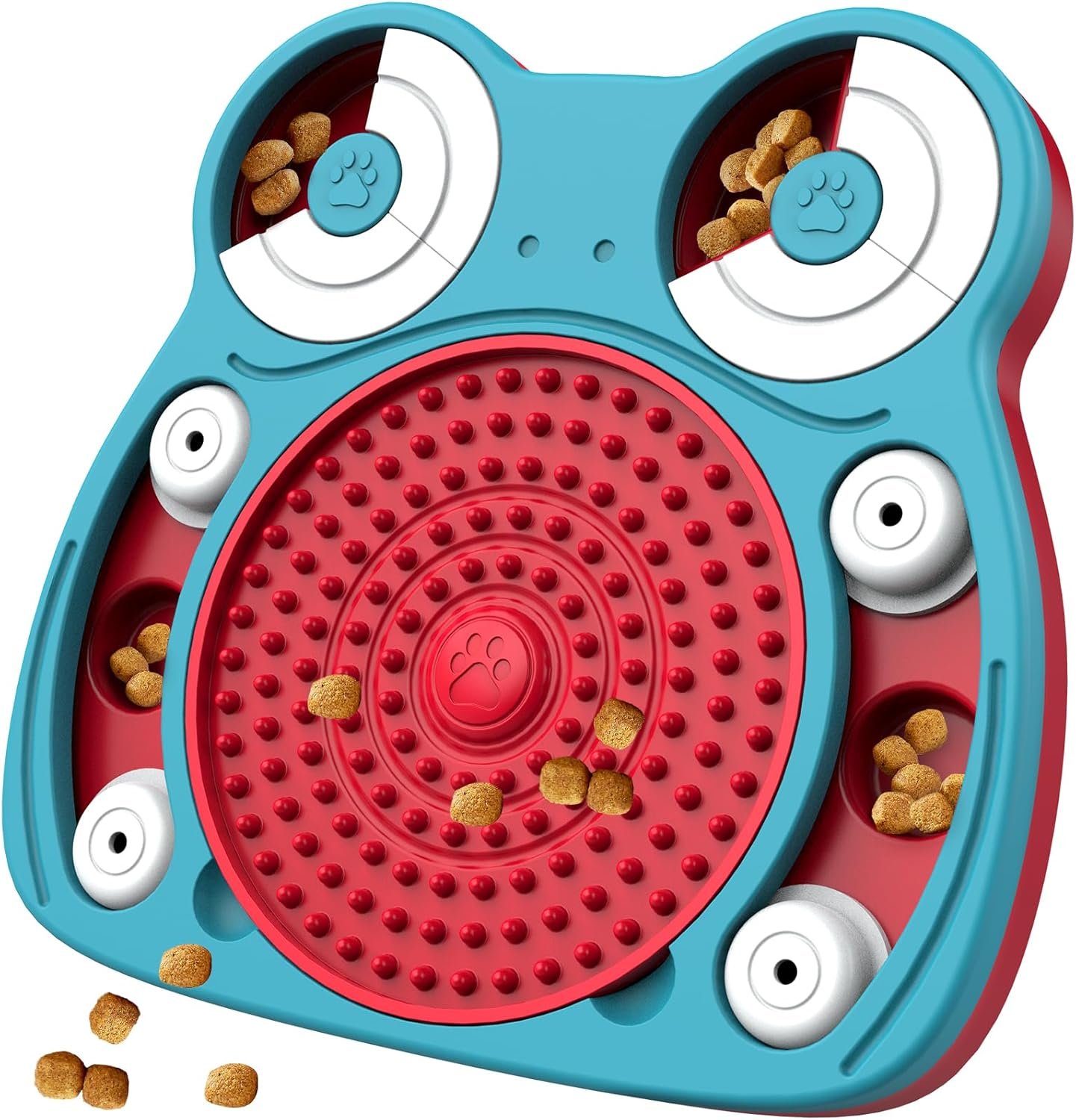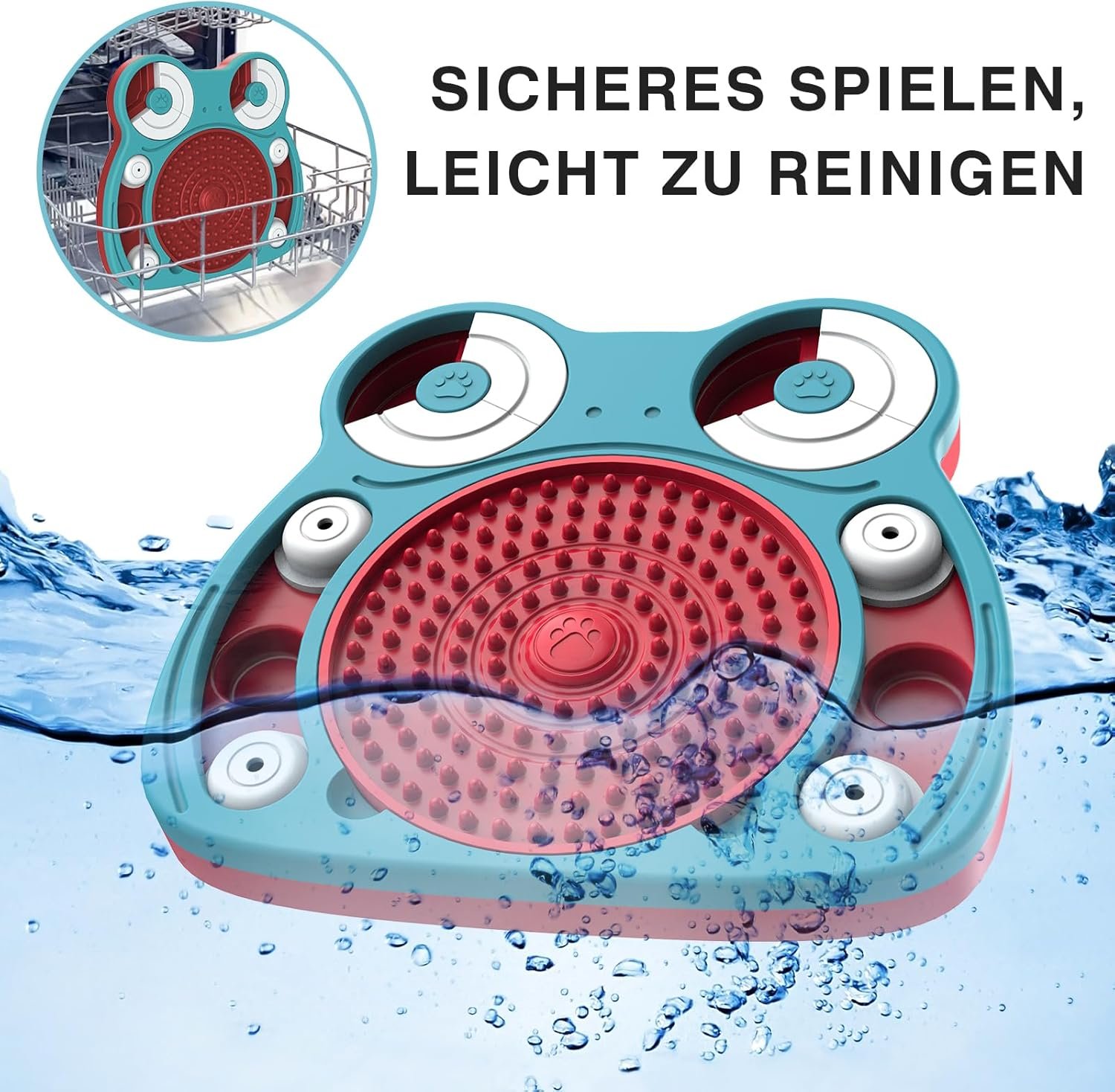 STABILES UND EINFACH ZU REINIGENDES DESIGN: Das durchdachte Design erstreckt sich bis zur Basis des Spielzeugs, wo an jeder Ecke vier rutschfeste Pads strategisch platziert sind. Diese Pads sorgen für einen festen Halt und verhindern, dass das Spielzeug während der enthusiastischen Slow-Food-Sessions Ihres Hundes herumrutscht. Die Reinigung nach dem Spielen ist ein Kinderspiel. Waschen Sie das Spielzeug einfach mit warmem Wasser und Seife oder werfen Sie es für eine gründliche und bequeme Reinigung in die Spülmaschine