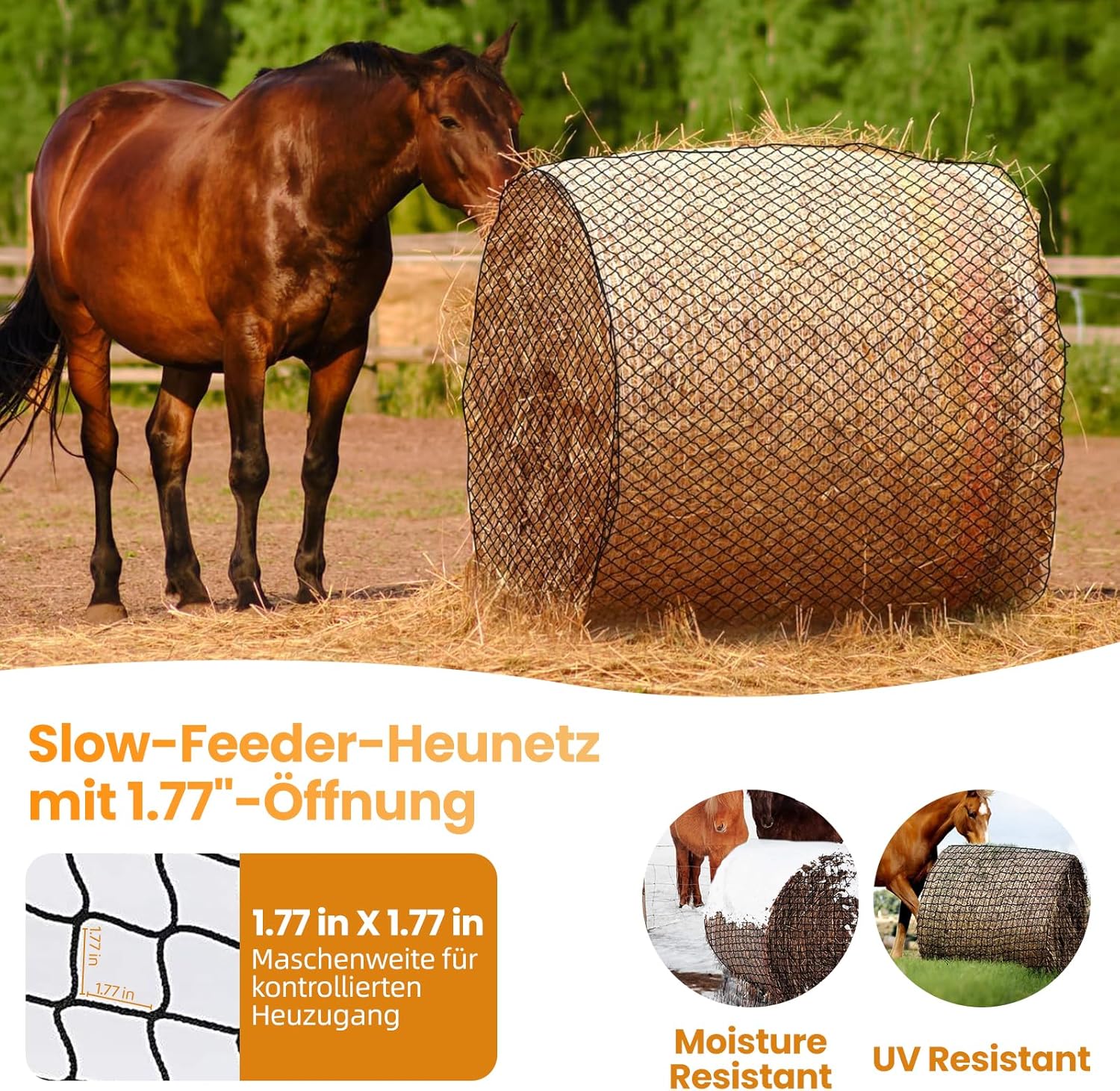 Optimale Größe und praktisches Zubehör: Mit 150 cm Höhe und 4,5 x 4,5 cm Maschenweite ist das Netz ideal für große Heuballen. Das 6 mm dicke Netz reduziert den übermäßigen Heuverbrauch, spart Geld und fördert eine gesunde Ernährung. Inklusive Tragetasche für einfachen Transport und Lagerung
