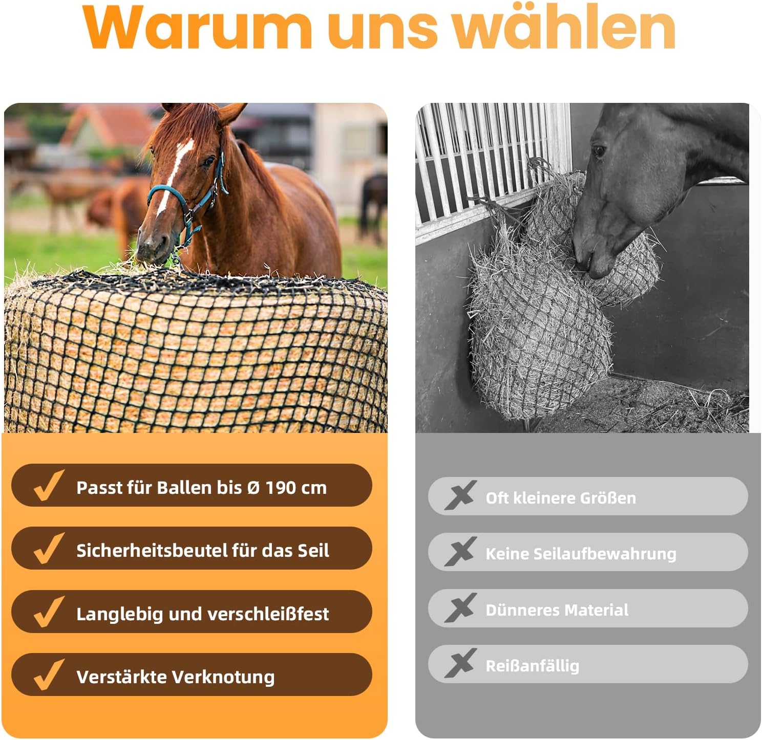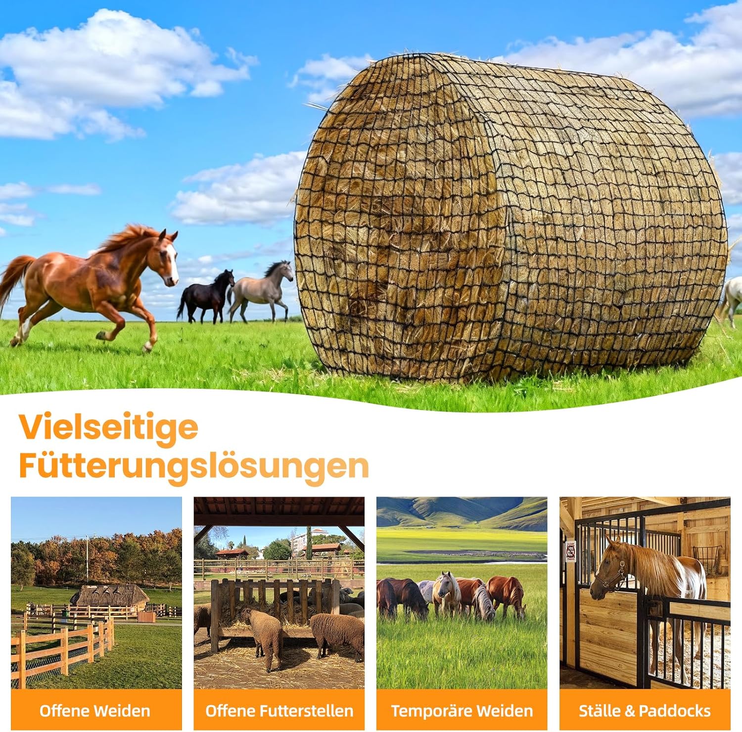 Unser Premium Heuballennetz ist die intelligente Lösung für moderne Tierhalter, die Wert auf die Gesundheit ihrer Tiere, eine sparsame Fütterung und mehr Freizeit legen. Konzipiert für den anspruchsvollen Einsatz im Innen- und Außenbereich verwandelt es herkömmliche Heuballen in eine artgerechte, erweiterte Futterstation.