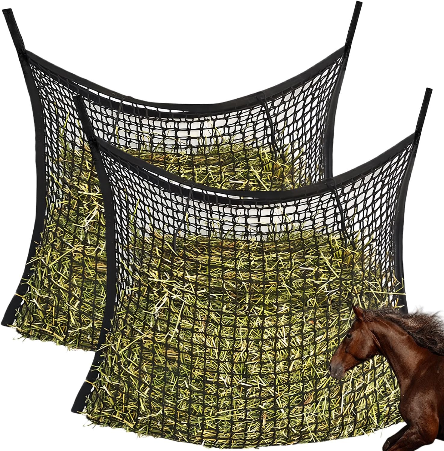 Set mit 2 Netzen: Dieses 2-Heu-Netz für Pferde wird mit 4 Karabinerhaken geliefert, sodass Sie die Netze einfach an verschiedenen Oberflächen befestigen können.
