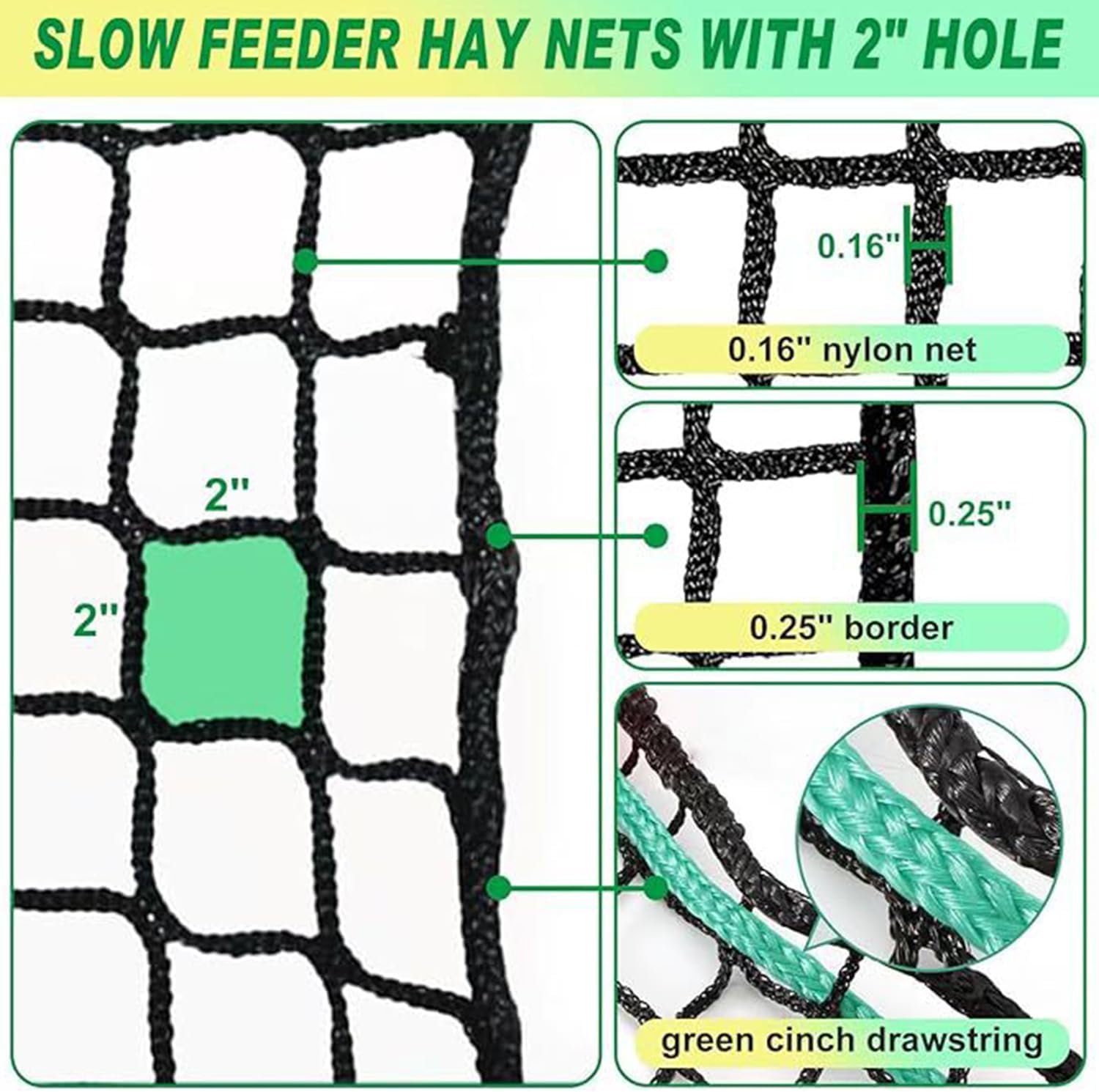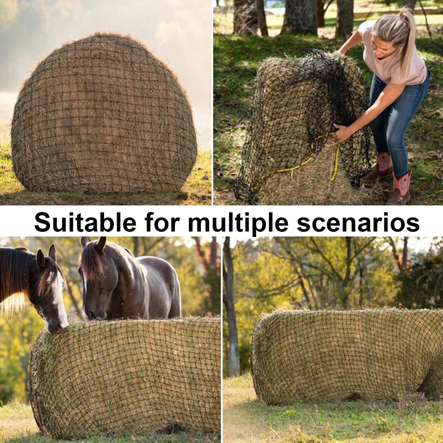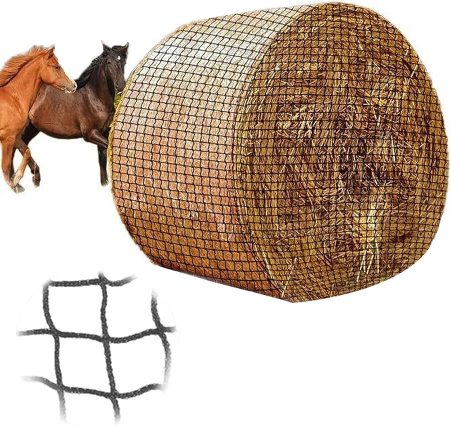 Gönnen Sie Ihrem geliebten Pferd ein natürlicheres und gesünderes Fütterungserlebnis! Unser Heunetz-Rundballen wurde speziell für Pferdebesitzer entwickelt und reduziert effektiv Futterverschwendung, verlangsamt die Fressgeschwindigkeit, fördert eine gesunde Verdauung und gibt Ihnen Sicherheit. Pferdefreundliches Design – keine Grate und keine Metallkanten, um Verletzungen im Maul zu vermeiden. Kann langfristig mit Lebensmitteln in Kontakt kommen, ohne dass die Gefahr einer chemischen Kontamination besteht. REDUZIEREN SIE DIE FUTTERVERSCHWENDUNG UM MEHR ALS 30 % – Das engmaschige Design verhindert das Verstreuen von Heu und senkt die Futterkosten erheblich. Fördert eine gesunde Verdauung – ahmt den natürlichen Weiderhythmus nach, verlangsamt übermäßiges Fressen und senkt das Risiko von Hernien und Fettleibigkeit bei Pferden. Extrem bissfest und reißfest – Hergestellt aus hochfestem HDPE-Material + UV-beständig, hält dem Fresskampf mehrerer Pferde und dem langfristigen Einsatz im Freien stand. Größe: 4 x 4 Fuß.