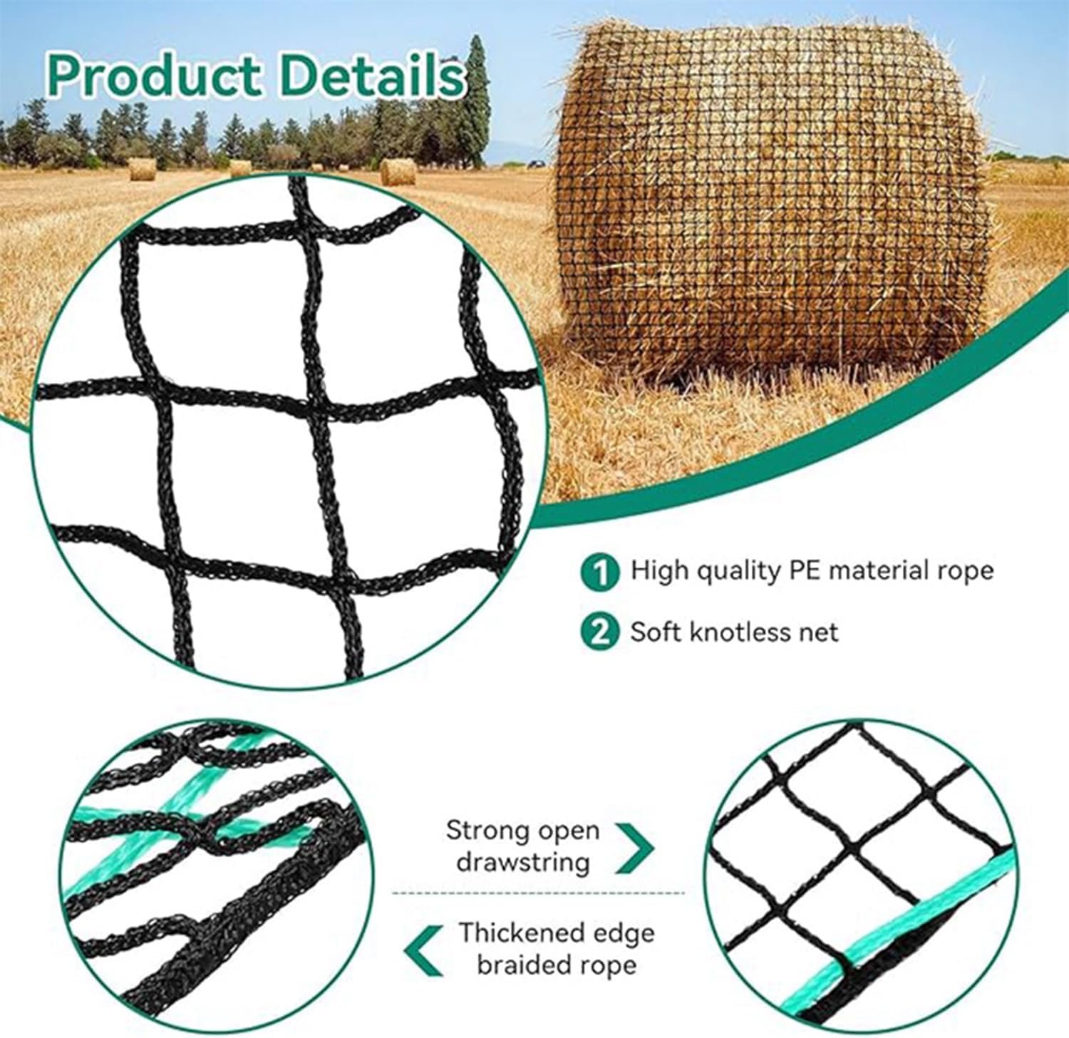 Optimale Größe: Dieses Modell mit einer Heunetz-Rundballenhöhe von mm und einem Durchmesser von 120 cm (4 x 4 ft) ist ideal für große Heuballen. Das Netz für Pferdeheu hat eine Maschenweite von 4 x 4 cm und eine Netzstärke von 5 mm.