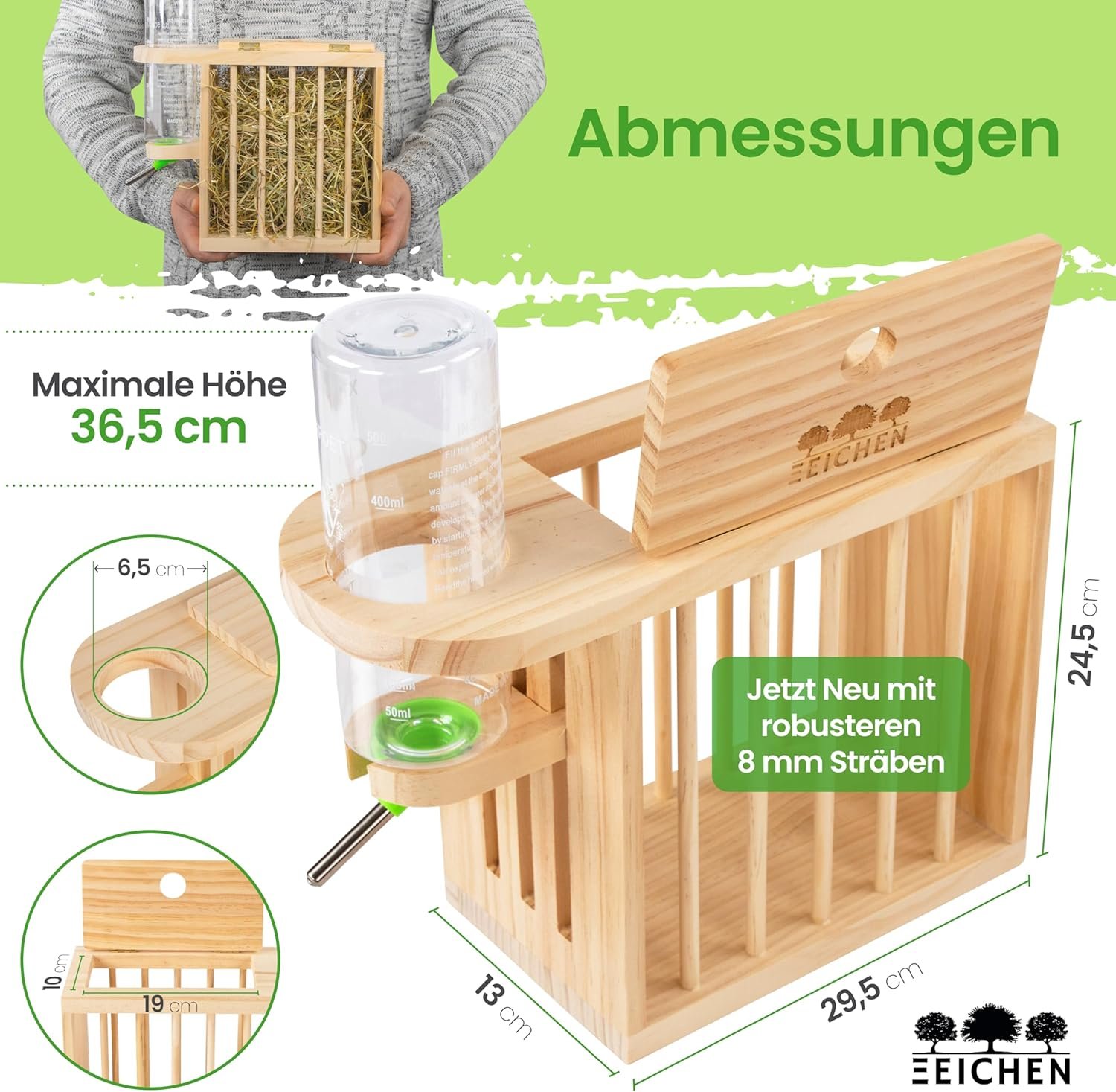 Technische Daten: Maße: ca. 24,5 x 29,5 x 13 cm (H x L x B) Gewicht: ca. 700 g (inkl. leerer Wasserflasche) Material Heuraufe: FSC-zertifiziertes Kiefern-Echtholz Material Trinkflasche: Kunststoff 500 ml Rohrmaterial: Edelstahl mit tropfsicherem Kugel-Edelstahlventil