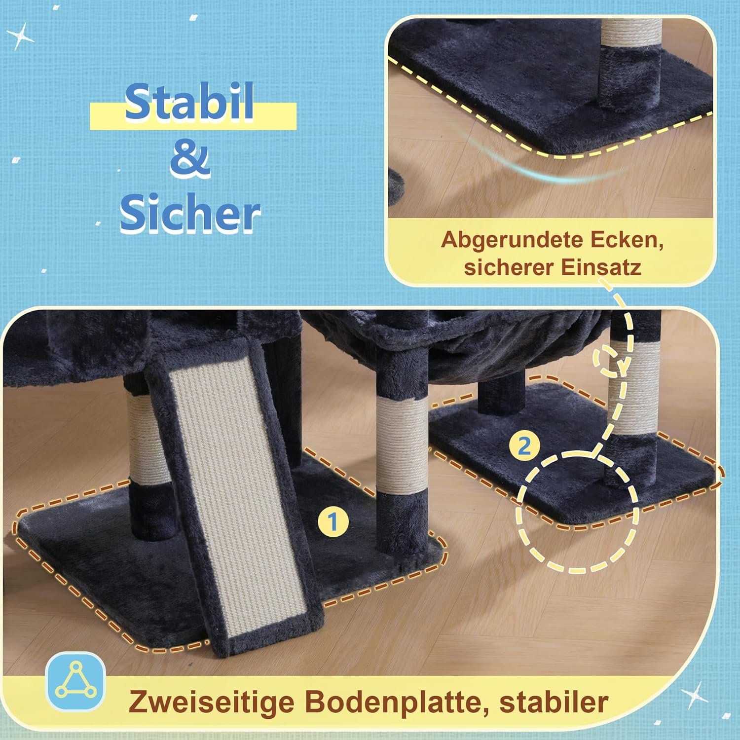 Stabil und sicher: Der Kratzbaum wird von zwei separaten Grundplatten getragen, maximale Stabilität durch geteilte Basis. Alle Paneele mit abgerundeten Ecken, keine scharfen Kanten – schützt Besitzer und Katzen vor Stößen