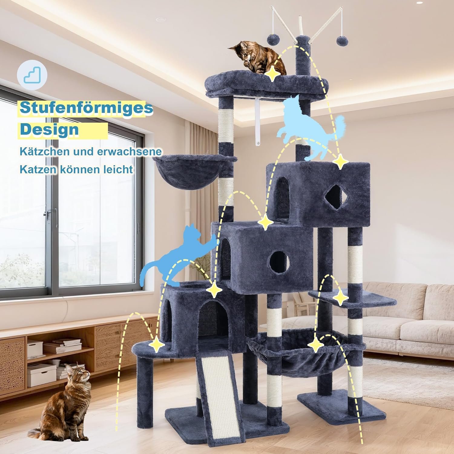 Stufenförmiges Kletterdesign. Die einzigartige treppenartige Struktur mit 3 gemütlichen Wohnungen und geräumigen Plattformen schafft einen natürlichen, leicht zu erklimmenden Pfad – für Kätzchen, alte und weniger bewegliche Katzen, die sich sicher und souverän auf dem hohen Baum bewegen können