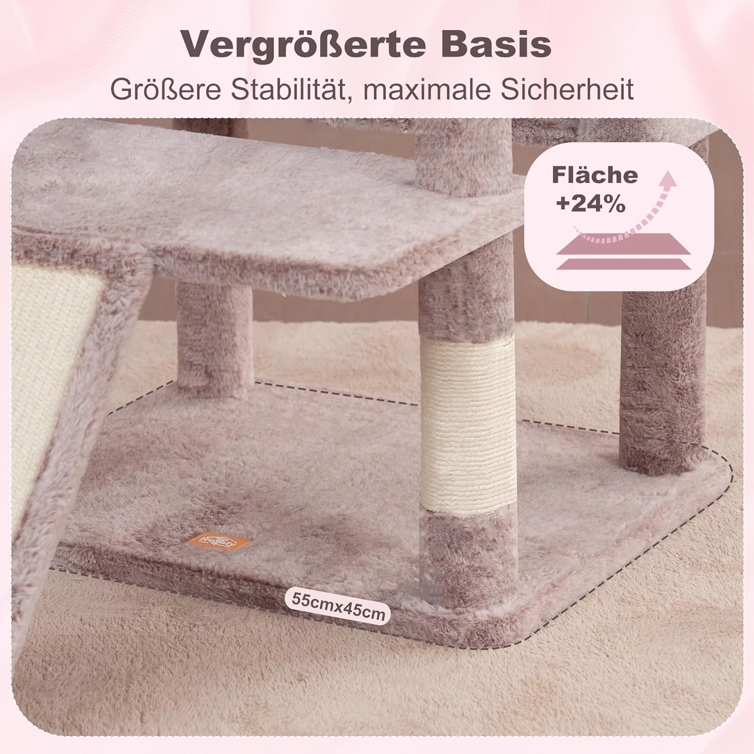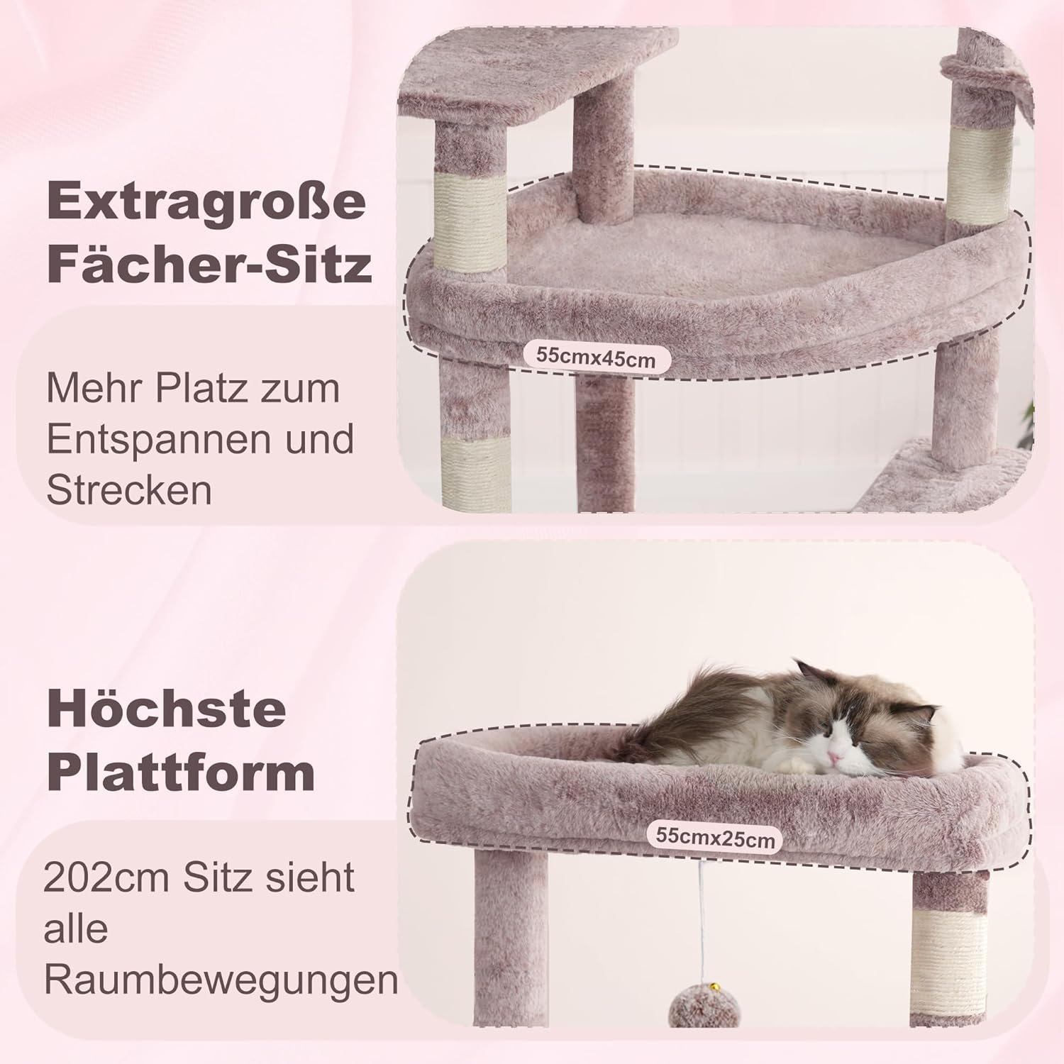 Geräumige obere Plattform: Dieser große Katzenkratzbaum im Format bietet zwei XL-Plattformen (55 x 45 cm und 55 x 25 cm) mit weicher Polsterung an Rand und Oberfläche. So genießt Ihre Katze entspannte Aussichten und angenehmen Schlafkomfort
