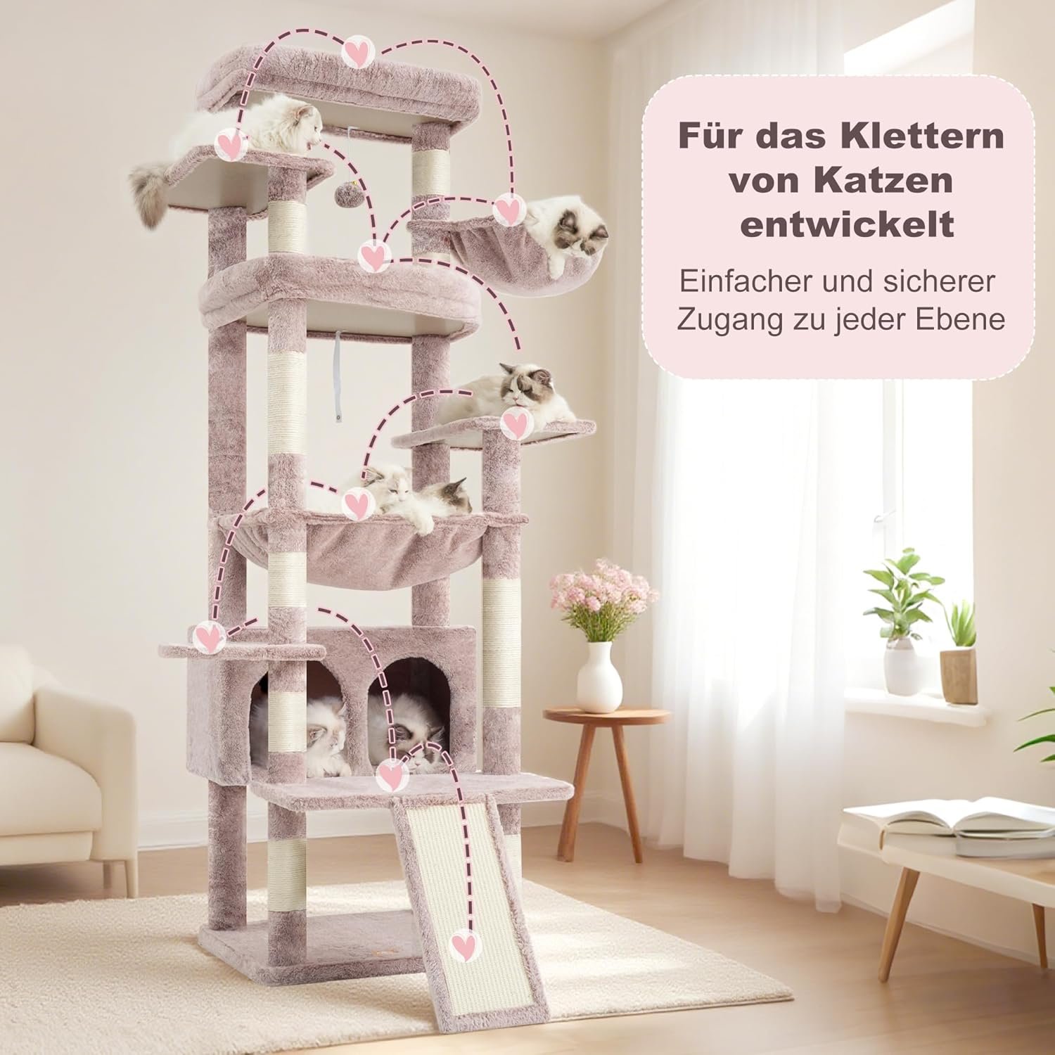 Mehrstufiges Design: Dieser Katzenkratzbaum bietet eine durchdachte Funktionsvielfalt mit mehreren Kletterebenen, großzügigen Liegeflächen sowie Sisalstämmen und Sisalschrägflächen. Ideal zur Befriedigung aller natürlichen Kletter- und Kratzbedürfnisse