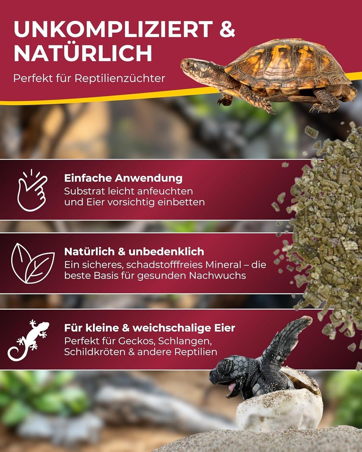 Einfache Anwendung – Optimieren Sie Ihre Reptilienzucht mit unserem Terrariensubstrat, das sich ideal für kleine und weichschalige Eier eignet und das gesunde Wachstum Ihrer Schützlinge unterstützt.