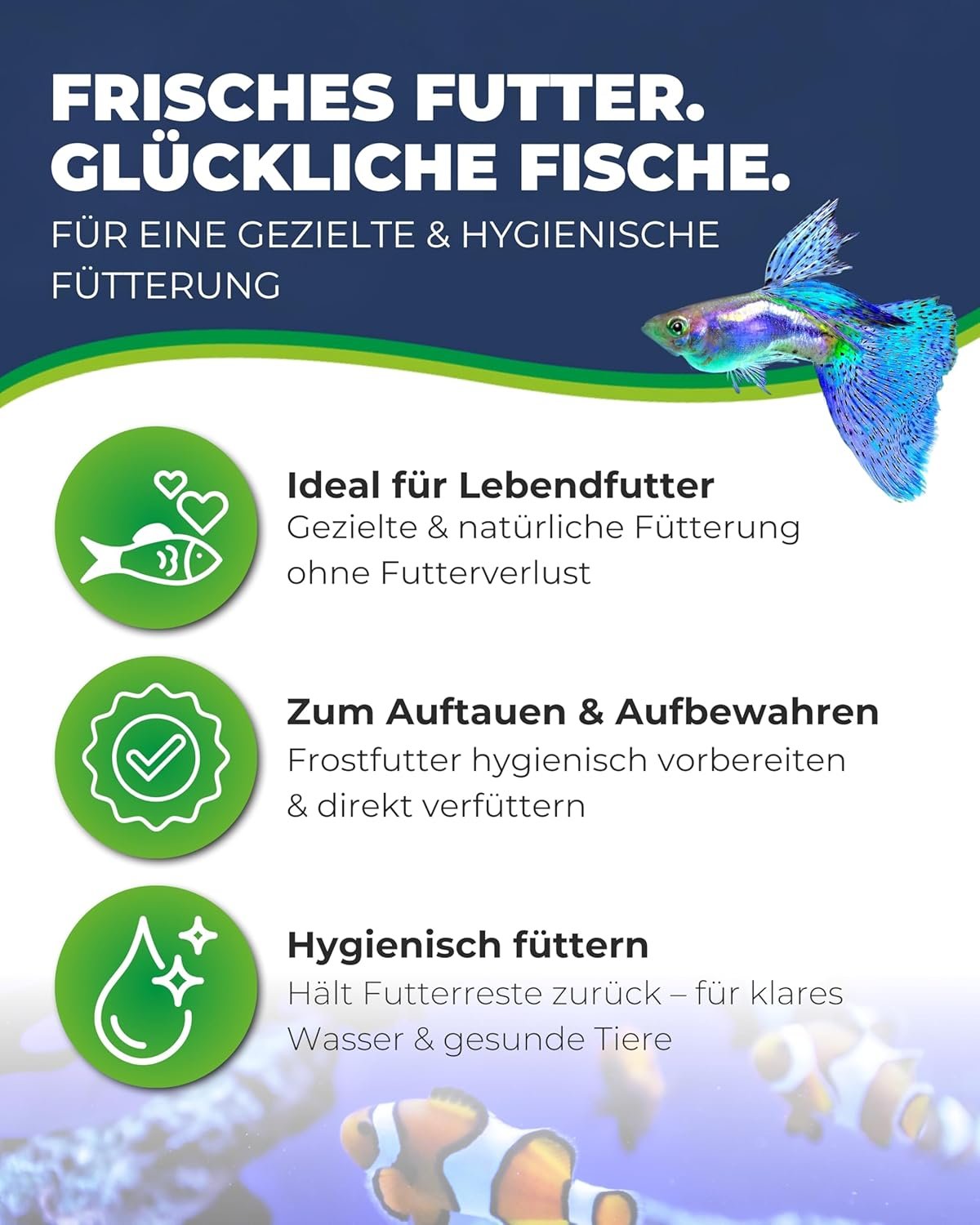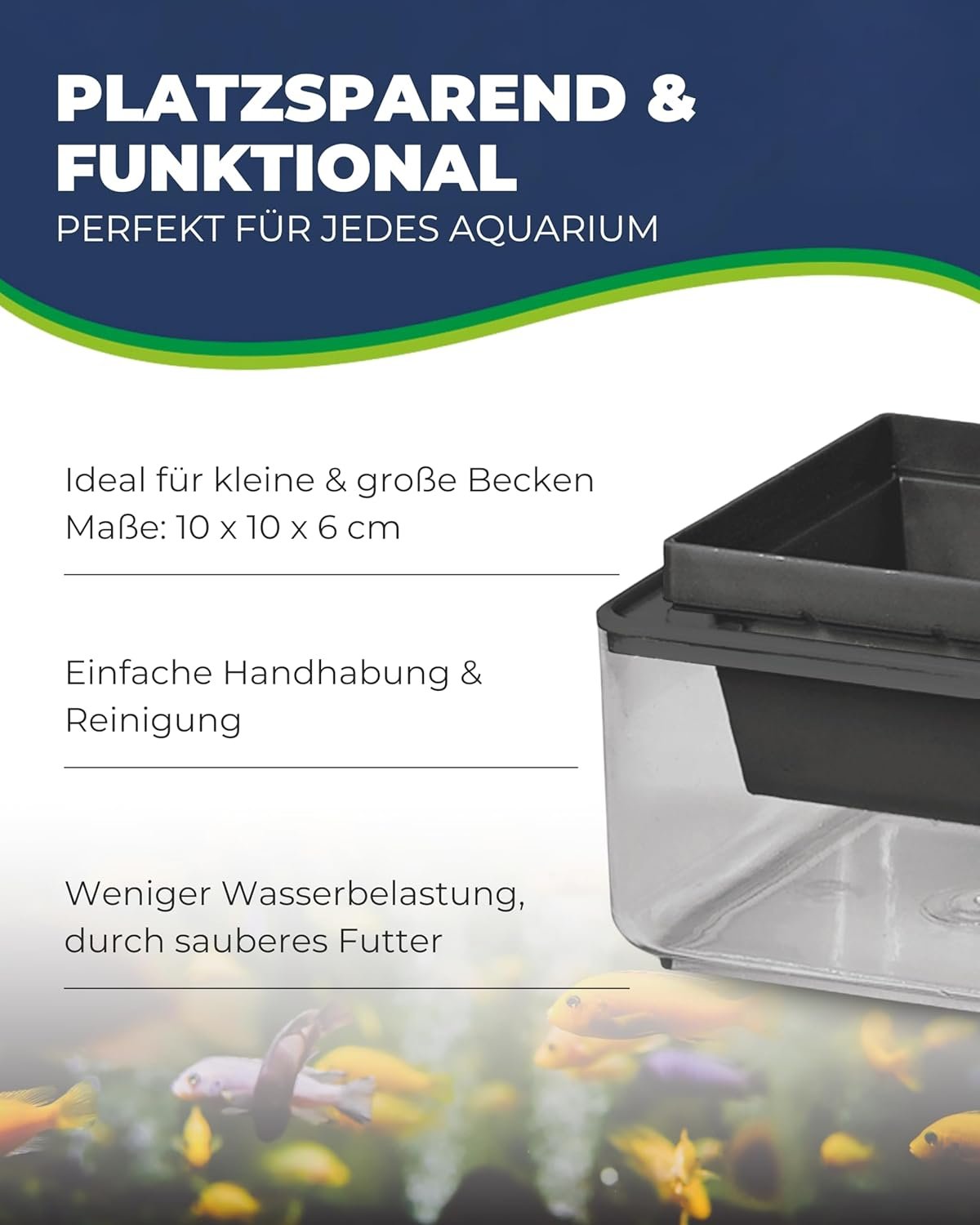 Sauberes Aquarium – der Einsatz des Futterbehälters für Fische verhindert durch sauberes Futter unnötige Verschmutzungen im Aquarium und trägt so langfristig zu einer besseren Wasserqualität bei.