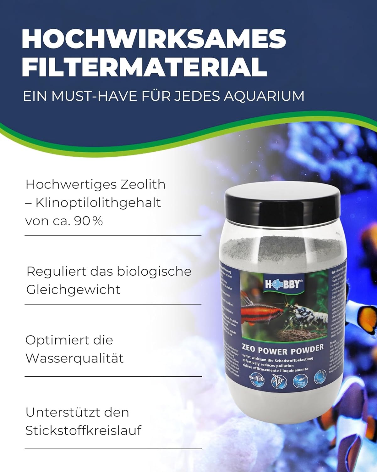 Einfache Anwendung – Das Zeolith-Power-Pulver kann direkt dem Aquarienwasser zugesetzt werden, entfernt so Schadstoffe ganz einfach und sorgt so für ein harmonisches Ökosystem in Ihrem Aquarium.