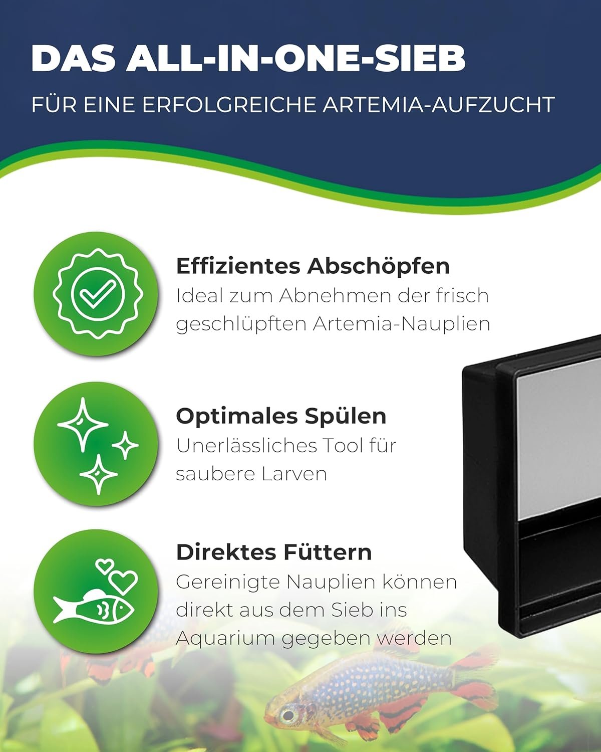 Ein Muss für alle Aquarienbesitzer – das Artemia-Sieb wurde speziell zum Abschöpfen von Artemia-Nauplien entwickelt und ist somit ein unverzichtbares Werkzeug für die Artemia-Züchtung.
