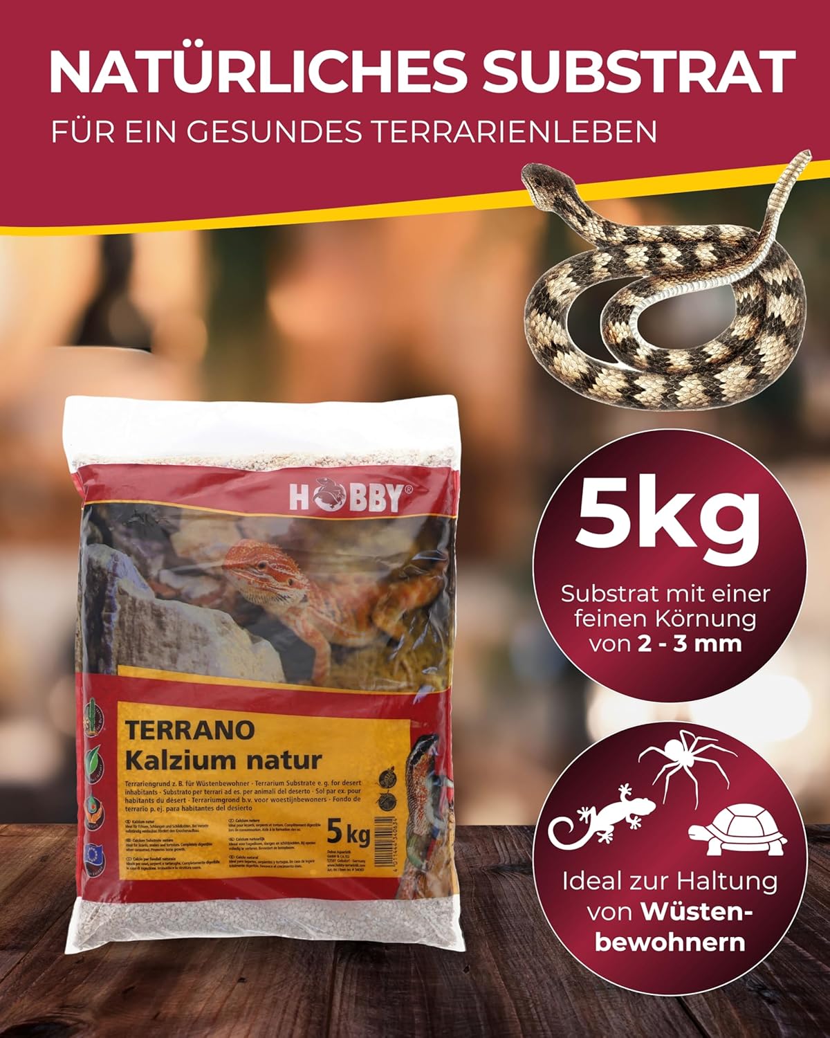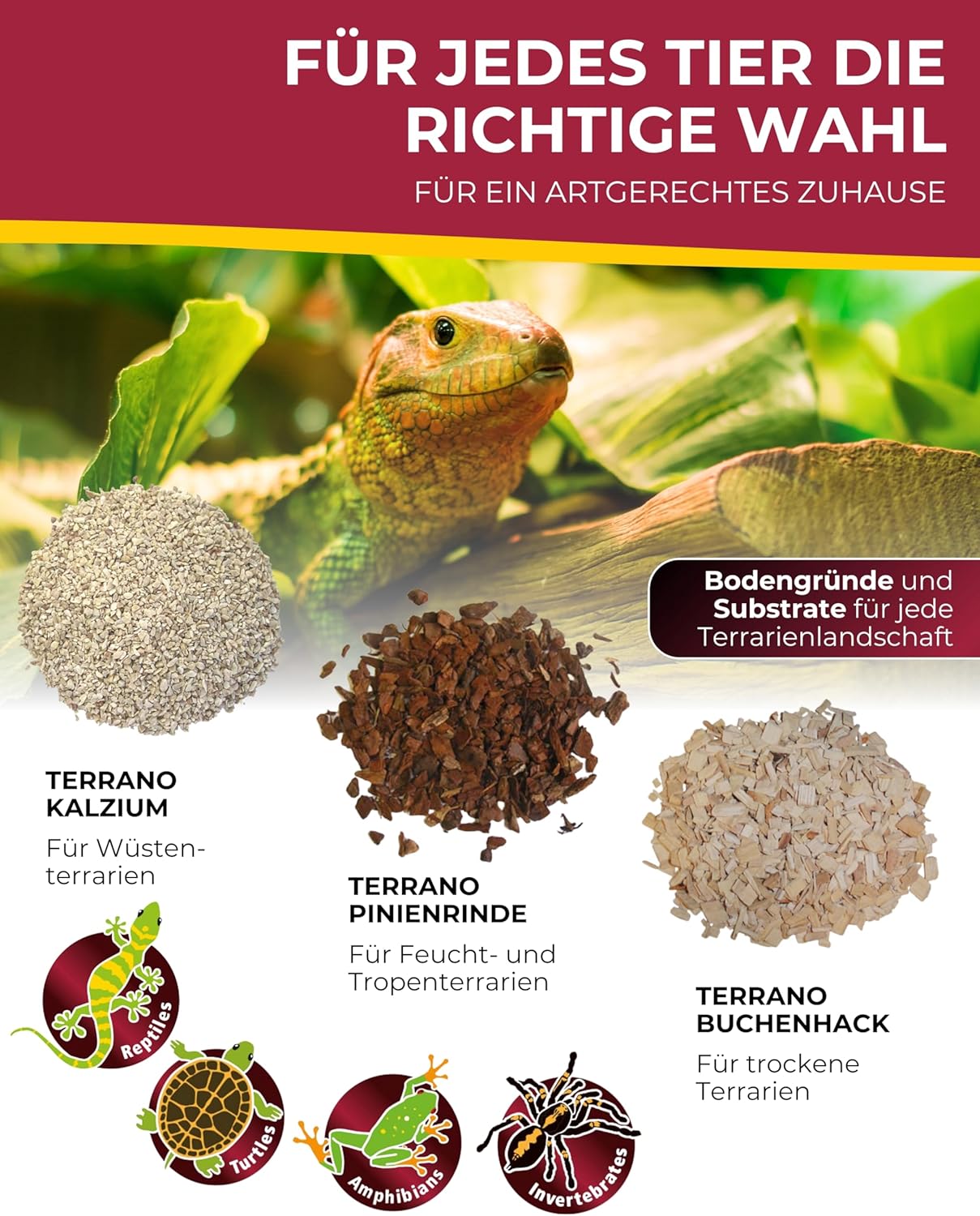 Natürliches Substrat – Terrano Calcium bietet die perfekte Grundlage für die Haltung von Eidechsen, Schlangen und Schildkröten und sorgt für ein gesundes, natürliches Zuhause für Ihre Reptilien.