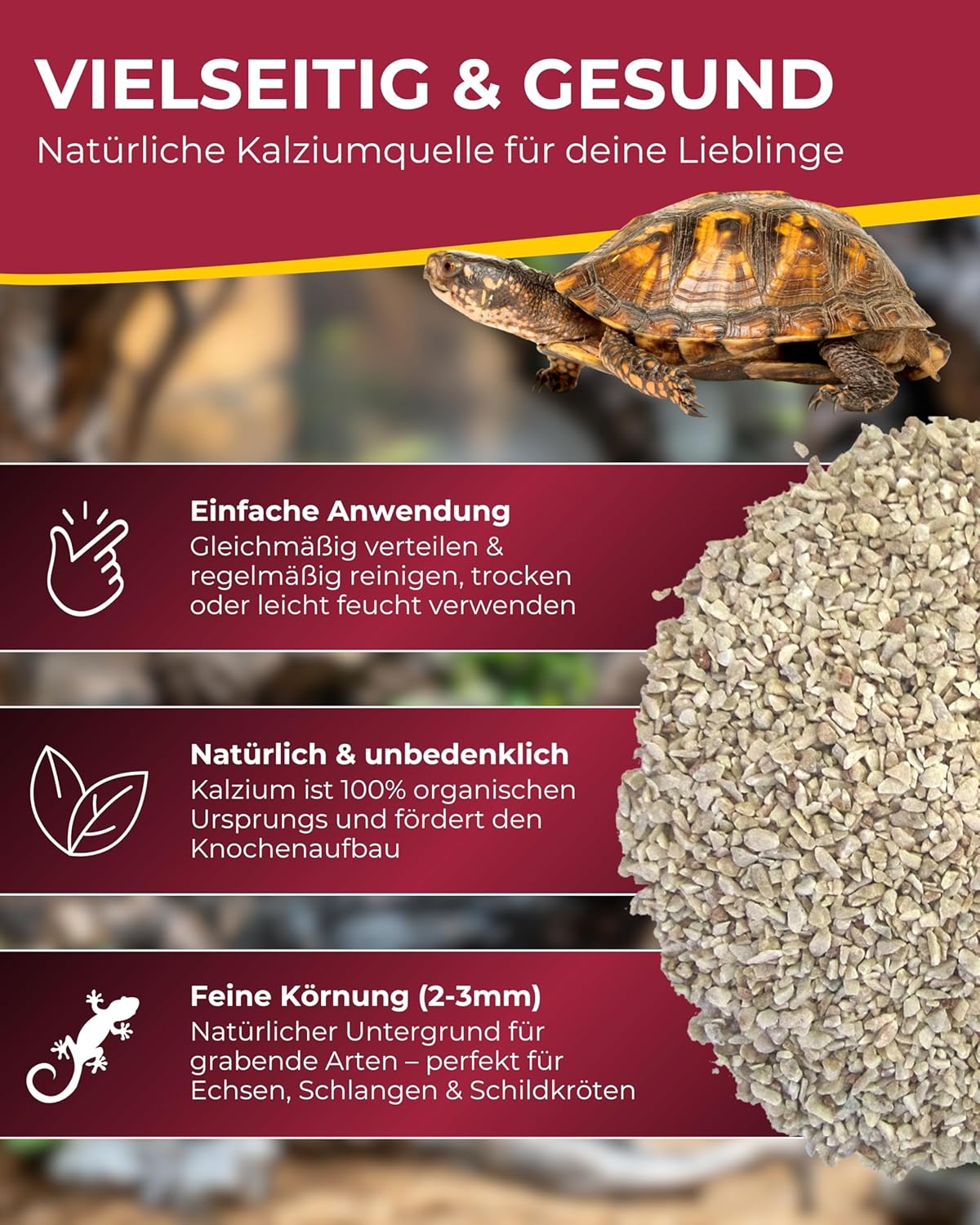 Vielseitiges Terrarienzubehör – Das hochwertige Calciumgranulat eignet sich perfekt als nährstoffreicher Bodengrund für Tiliqua sp., Agrionemys sp. und Phrynosoma sp.