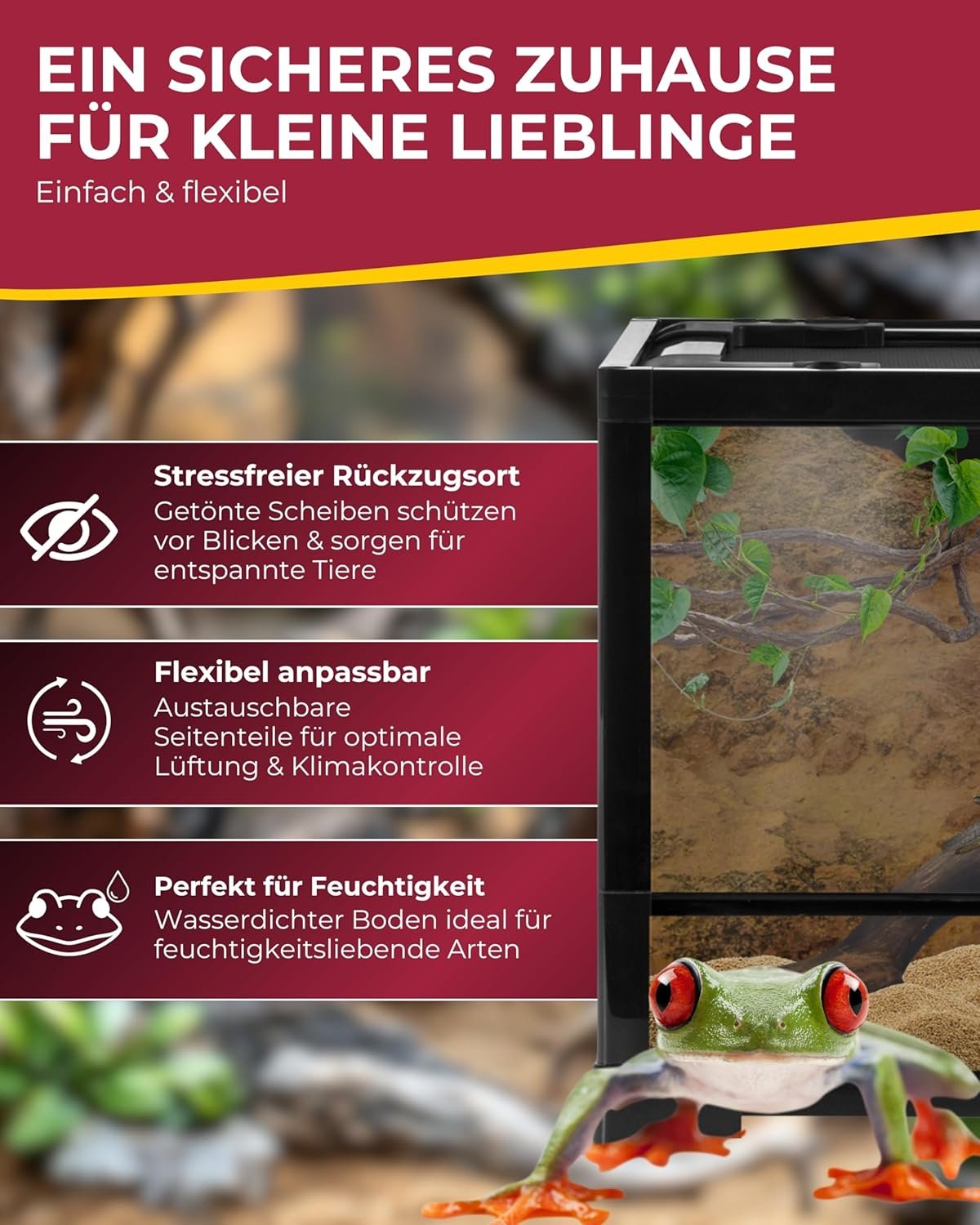 Optimale Umgebung: Der wasserdichte Boden unseres Terrariums sorgt für ideale Feuchtigkeitsbedingungen und bietet eine perfekte Umgebung für Tiere wie Rotbauchstürme und Pfeilgiftfrösche.