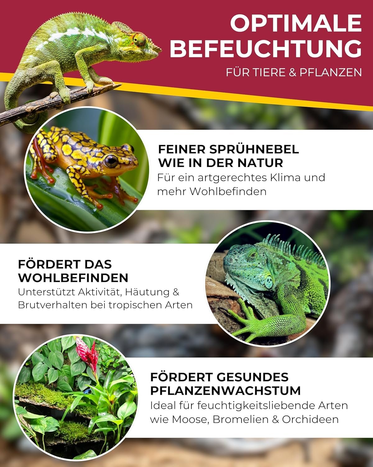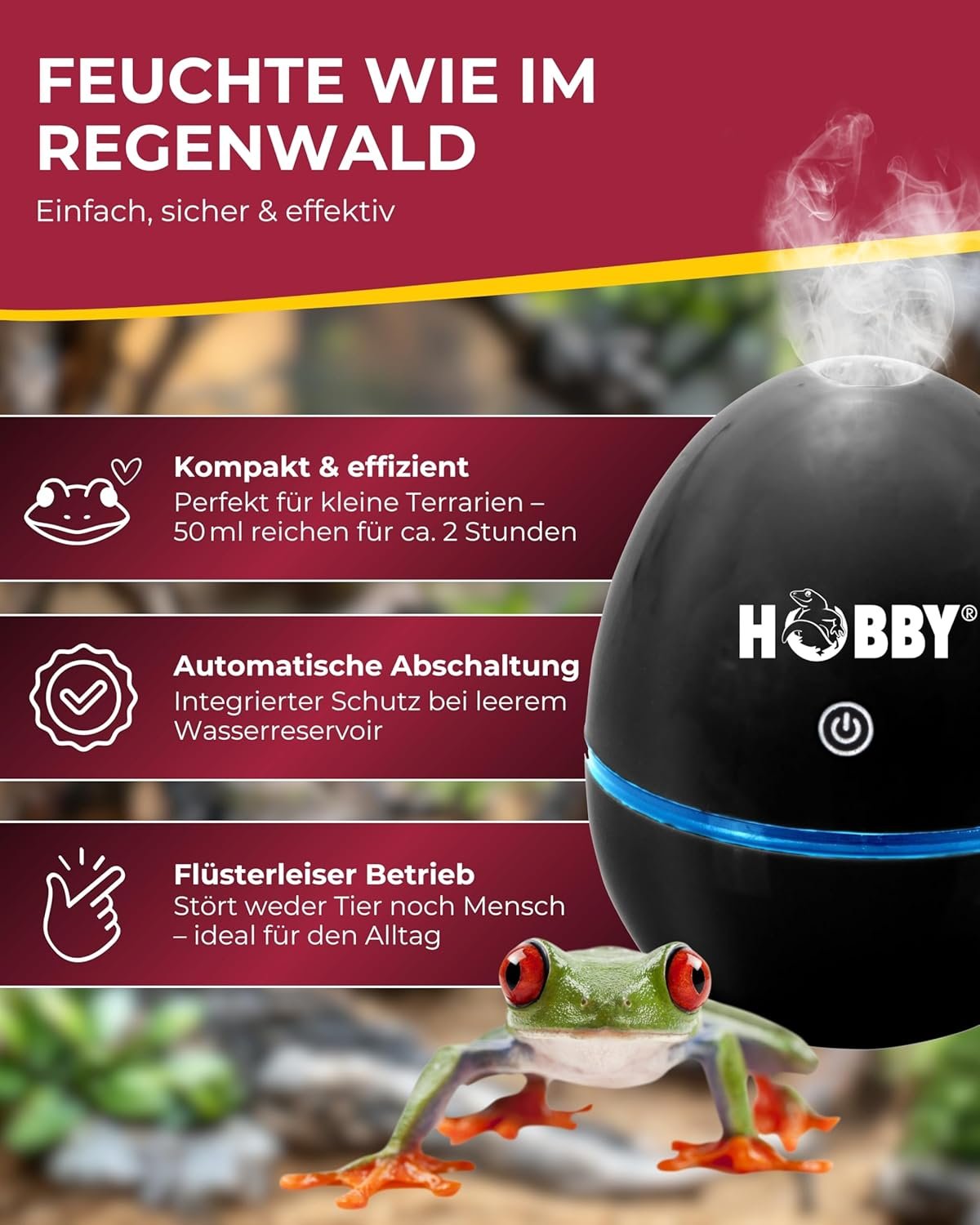 Plug & Play – Auspacken, befüllen und anschließen! Dieses benutzerfreundliche Nebelsystem zur Erhöhung der Luftfeuchtigkeit in Terrarien ist gebrauchsfertig und ideal für kleinere Terrarien.