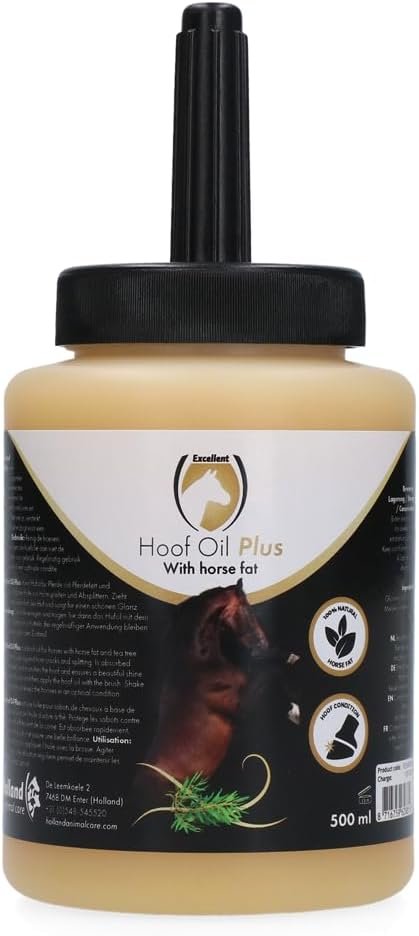 Excellent Hoof Oil Plus zieht sehr schnell in die Hufwand ein, ohne eine Versiegelungsschicht zu bilden. Darüber hinaus verleiht dieses Produkt dem Huf einen schönen Glanz. Wir empfehlen, Hufe in schlechtem Zustand über einen Zeitraum von ca. 2 Wochen täglich zu reiben. Zur Pflege reichen 2 bis 3 Mal pro Woche.