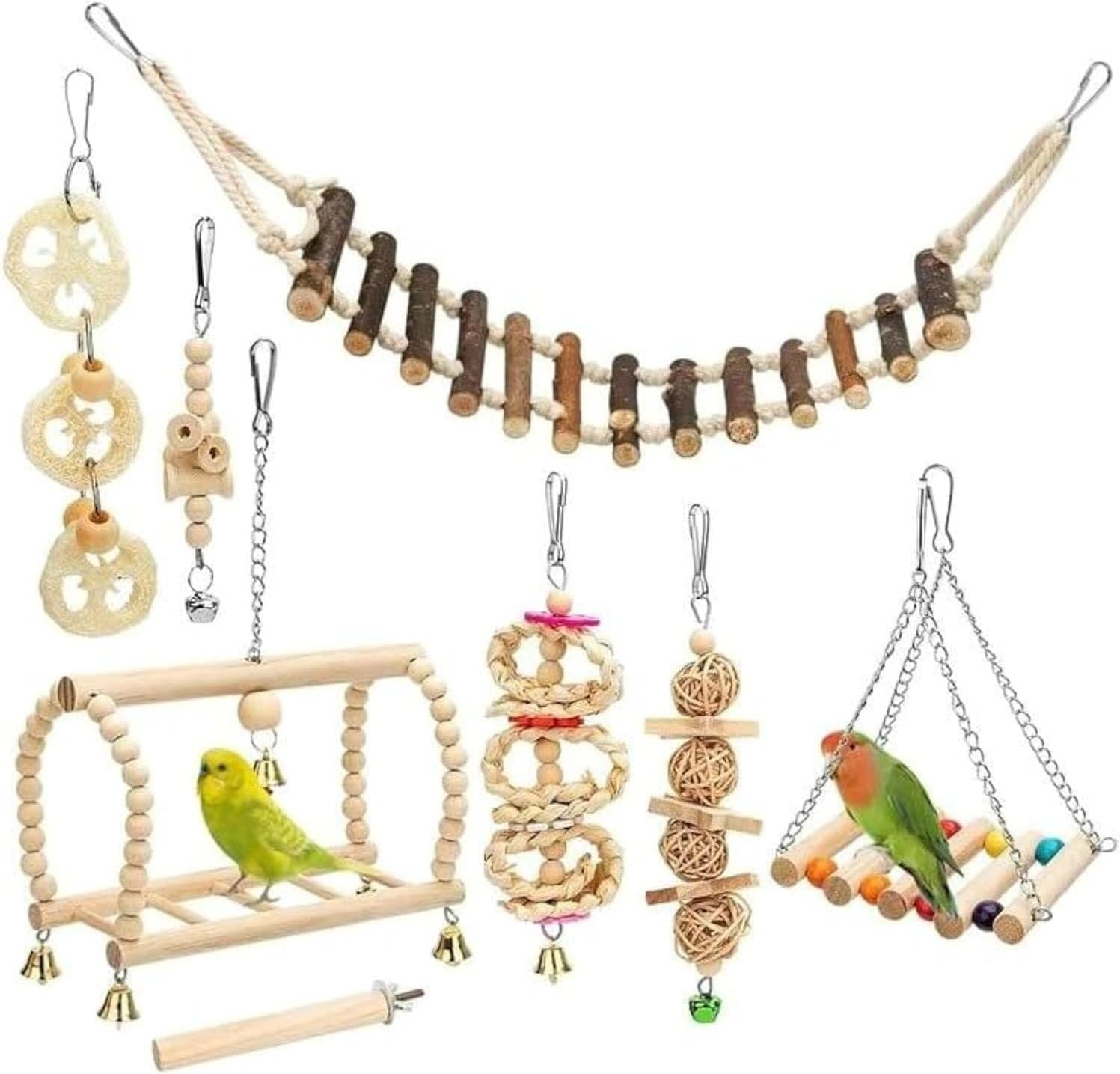 Abwechslungsreiches Papageienspielzeug aus Holz: Enthält acht verschiedene Arten von Vogelunterhaltungsspielzeugen aus natürlichem Holz. Diese Spielzeuge sind in mehrere Ebenen unterteilt und bieten Ihrem geliebten Vogel einen idealen Ort für Luftaktivitäten, Kauen und Klettern