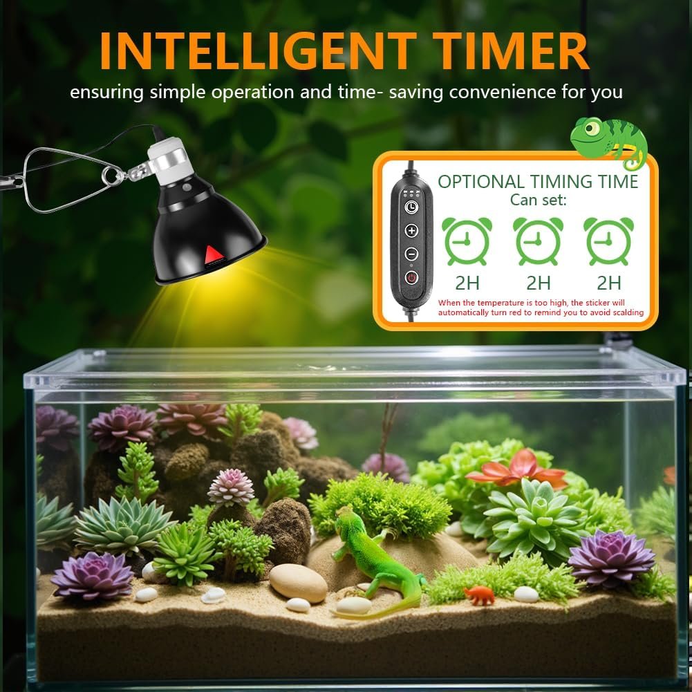 【Intelligente Einstellfunktion】 Dieser Lampenschirm mit Kuppelheizung ist mit einem Dimm-Timer ausgestattet, der 2-, 4- und 8-Stunden-Optionen und eine voreingestellte Heizzeit bietet. Es verfügt auch über eine Dimmfunktion. Durch einfaches Drücken der +/- Taste können Sie die Temperatur an Ihre Bedürfnisse anpassen und so ein gesundes Wachstum Ihrer Reptilien fördern