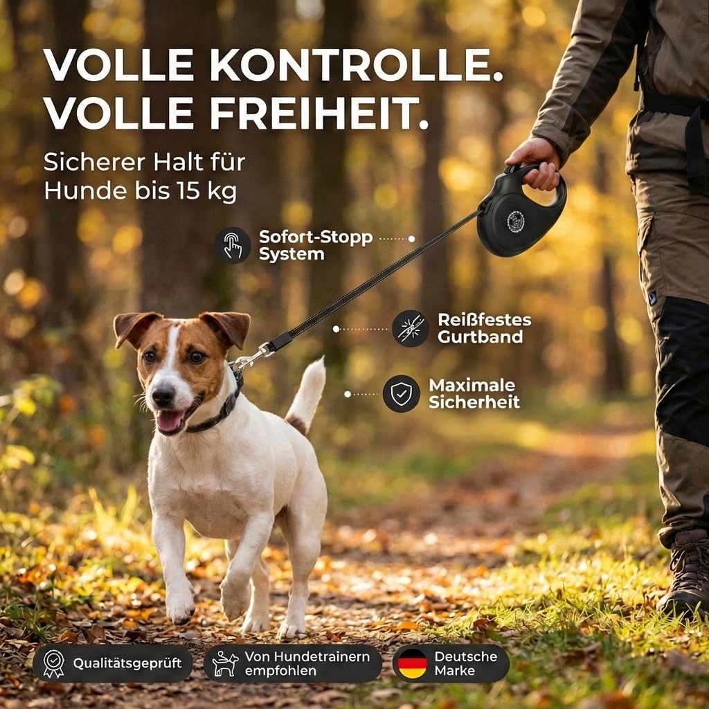 Einfache Handhabung: Die ausziehbare Hundeleine ist dank der cleveren Konstruktion einfach zu bedienen. Der 5 m lange Gurt der Rollleine lässt sich problemlos aus- und aufrollen. Das Bremsstoppsystem verfügt über einen Brems- und Dauerstoppknopf