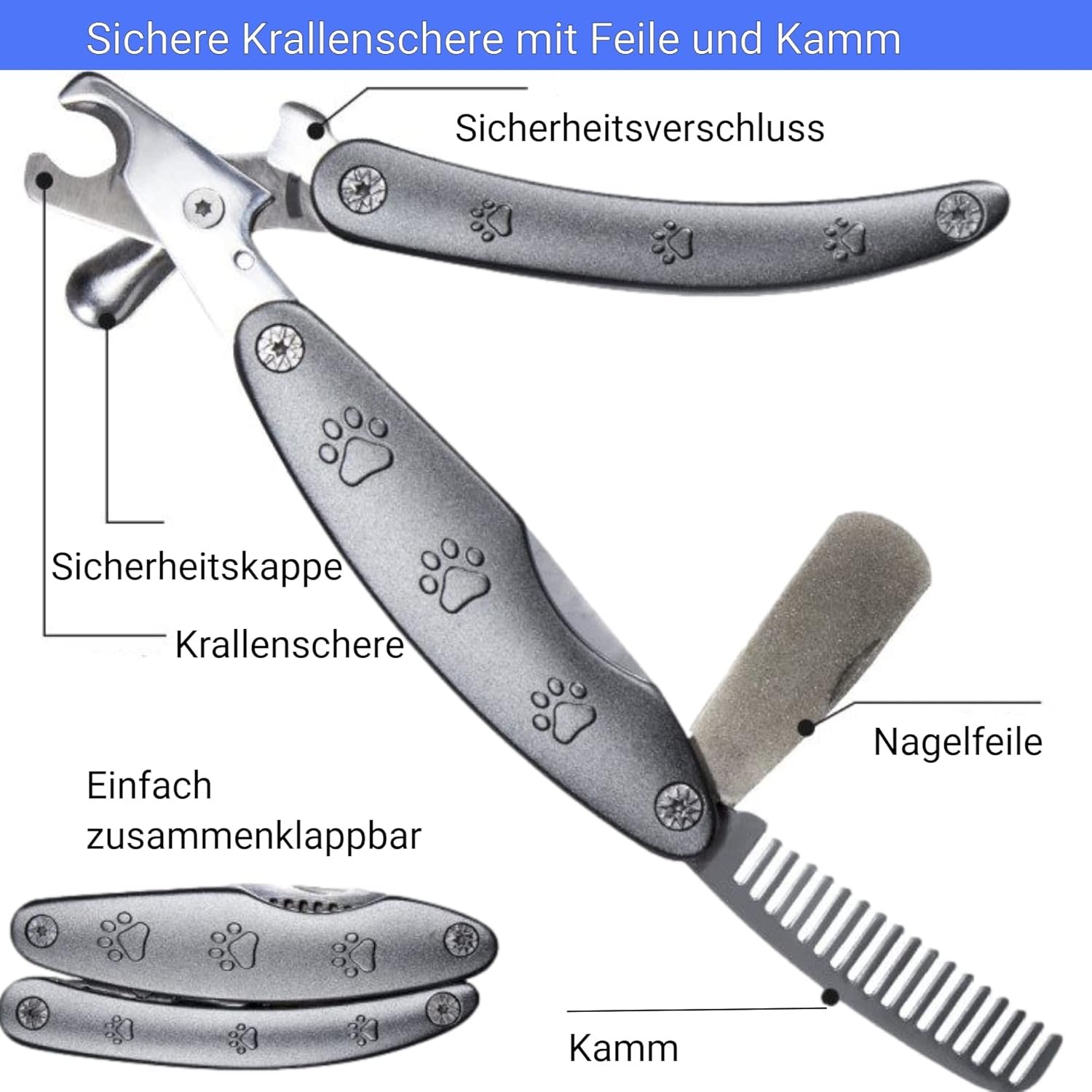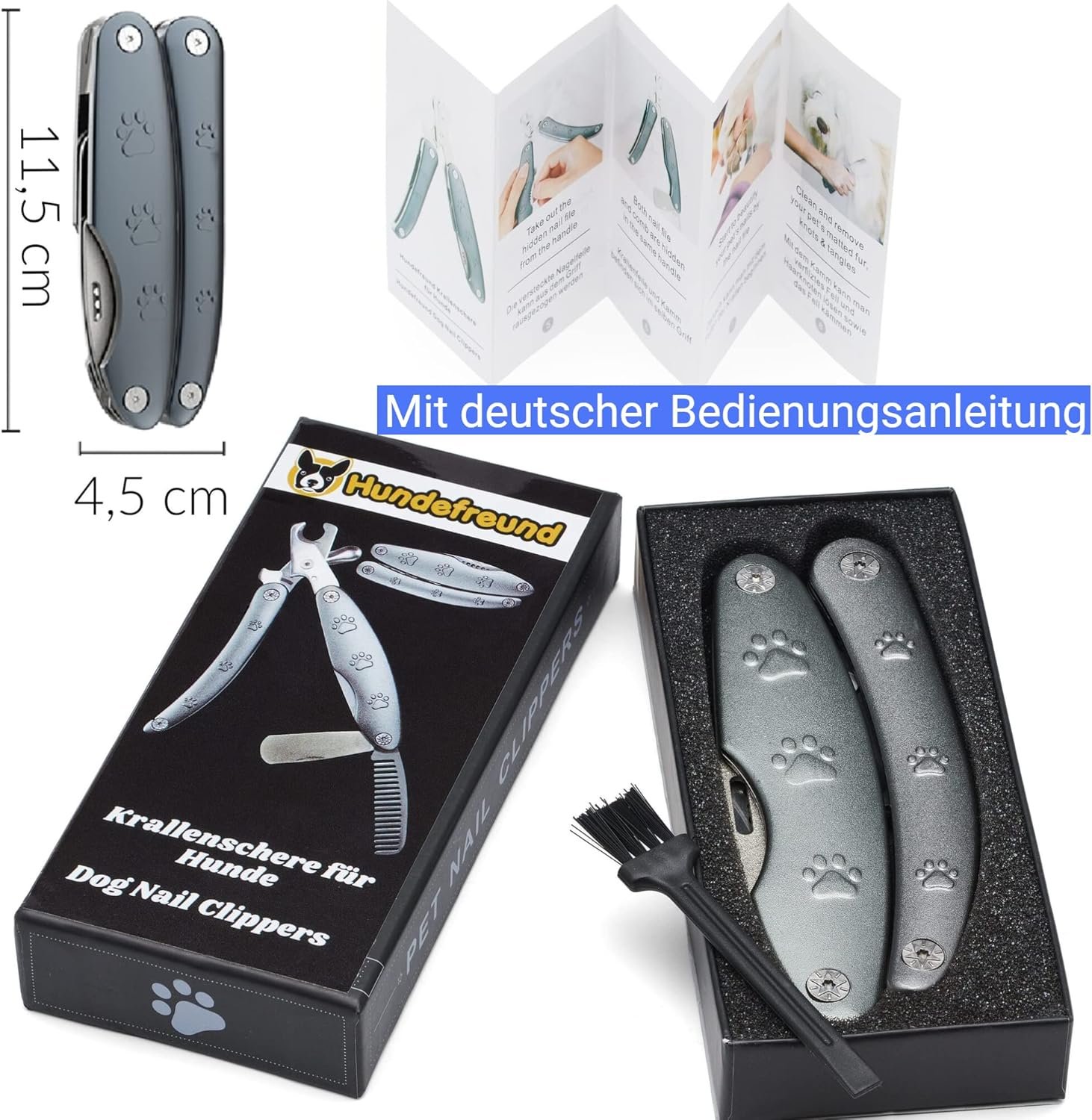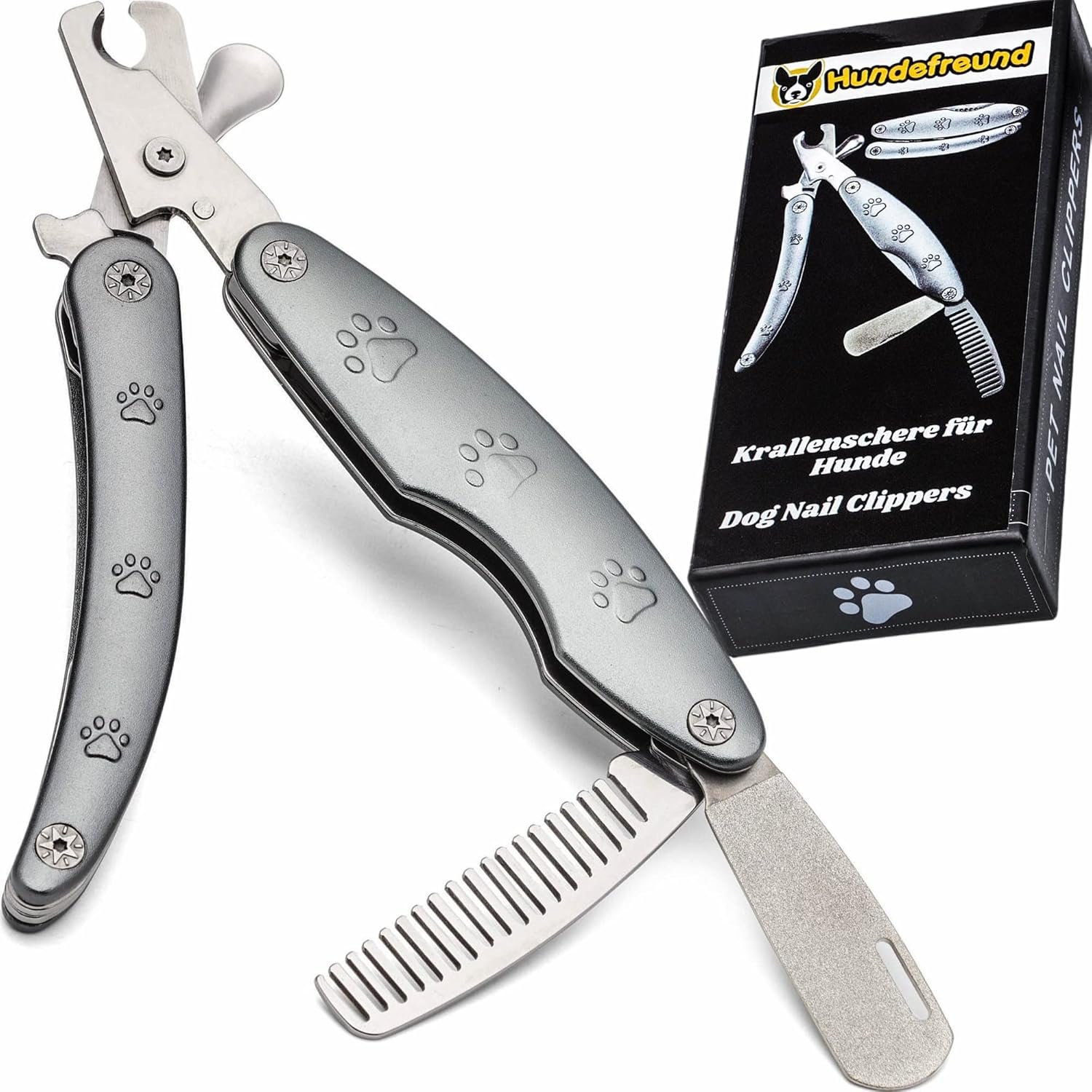 Nagelschere, Hundefeile und Hundekamm in einem – eine hochwertige Krallenschere im auf- und zugeklappten Zustand, eine Feile und ein Kamm sind ausklappbar speziell für Hunde mit Griff
