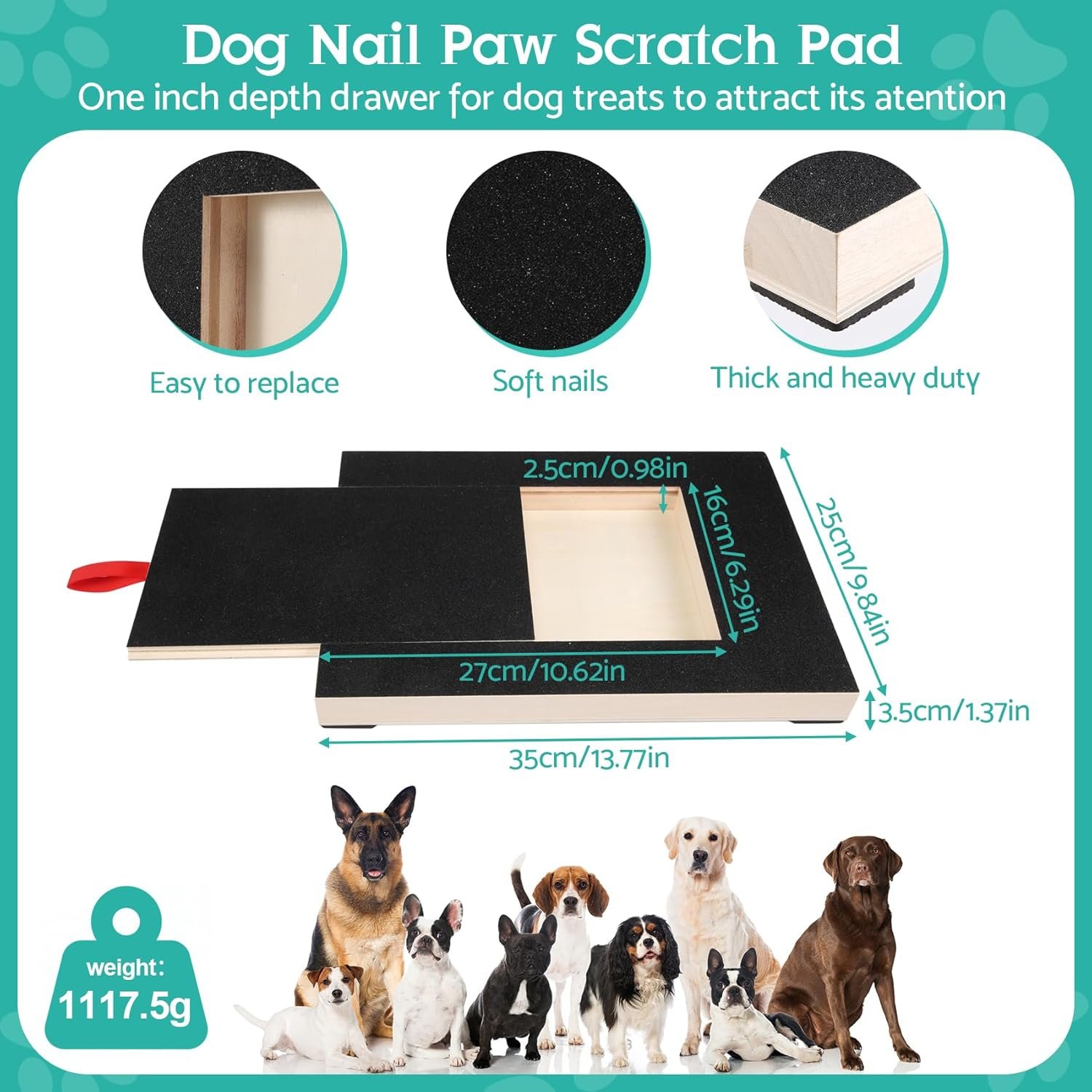 Das Kratzbrett für Hunde verfügt über versteckte Nägel zum natürlichen Tragen und einen Gummifuß, der den Boden vor Kratzern schützt.