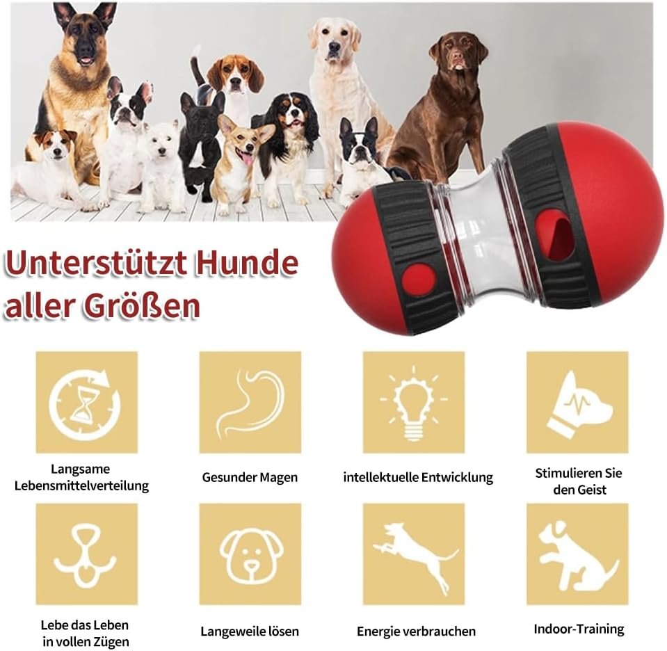 Das Haustier-Puzzle-Spielzeug ist für Hunde aller Größen geeignet. Es ist an beiden Enden mit unterschiedlich großen Bällen ausgestattet, die es dem Hund ermöglichen, das Spielzeug in einem bestimmten Bereich herumzuschieben, was Spiel und Aktivität fördert. Während sich das Spielzeug bewegt, werden Leckereien durch kleine Löcher auf beiden Seiten freigesetzt, was für ein unterhaltsames Erlebnis sorgt.