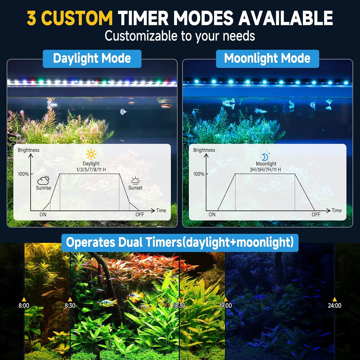 Drei Modi verfügbar: ① Nur Tageslicht mit sechs Timer-Optionen, Standardfarbe und wählbarer Helligkeit. ② Nur Mondlicht mit vier Timer-Optionen, wählbarer Farbe und Helligkeit. ③ Stellen Sie Tageslicht und Mondlicht über einen Dual-Timer ein, der nacheinander läuft und so den herkömmlichen 24/7-Zeitplan ersetzt