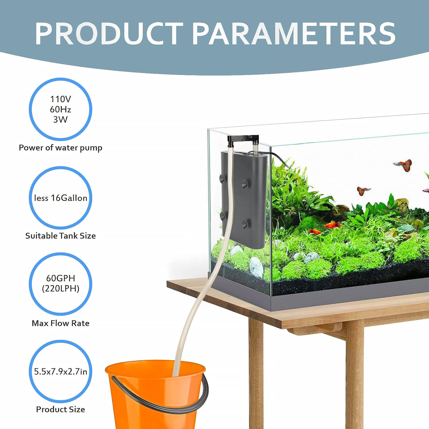 PRODUKTPARAMETER: Wasserpumpenleistung: Maximaler Durchfluss: 227 LPH; Geeignete Tankgröße: weniger als 16 Gallonen; Filtermaterial: 3 Lagen Filterplatten (Aktivkohle) und Schwammfilter. Die mechanische und biologische Filterung erfolgt mehr als sechsmal pro Stunde, um eine saubere Wasserumgebung zu gewährleisten