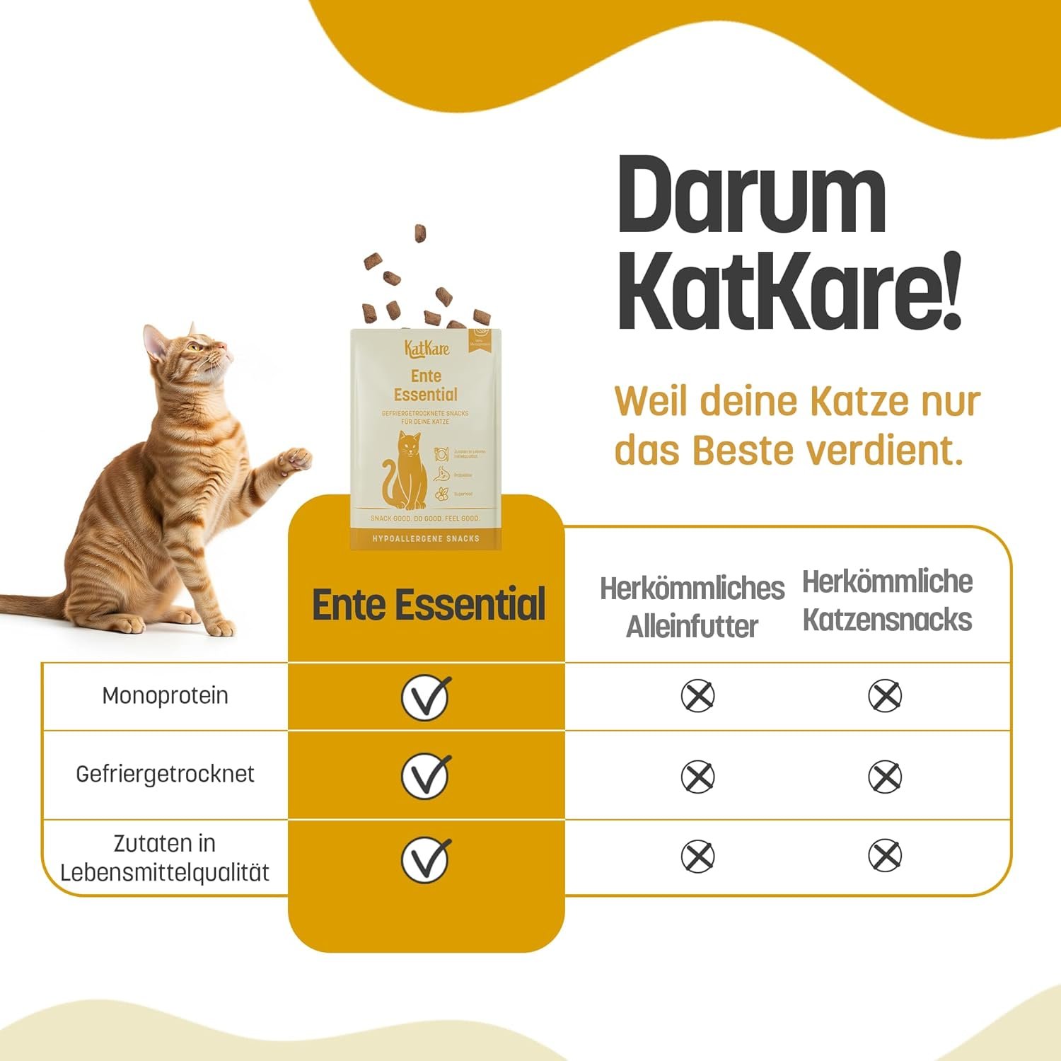 Ausschlussdiät leicht gemacht – Dank der klaren Zusammensetzung sind unsere Snacks ideal für eine Ausschlussdiät. Sie können ganz einfach testen, was Ihre Katze gut verträgt – Allergiemanagement war noch nie so einfach.