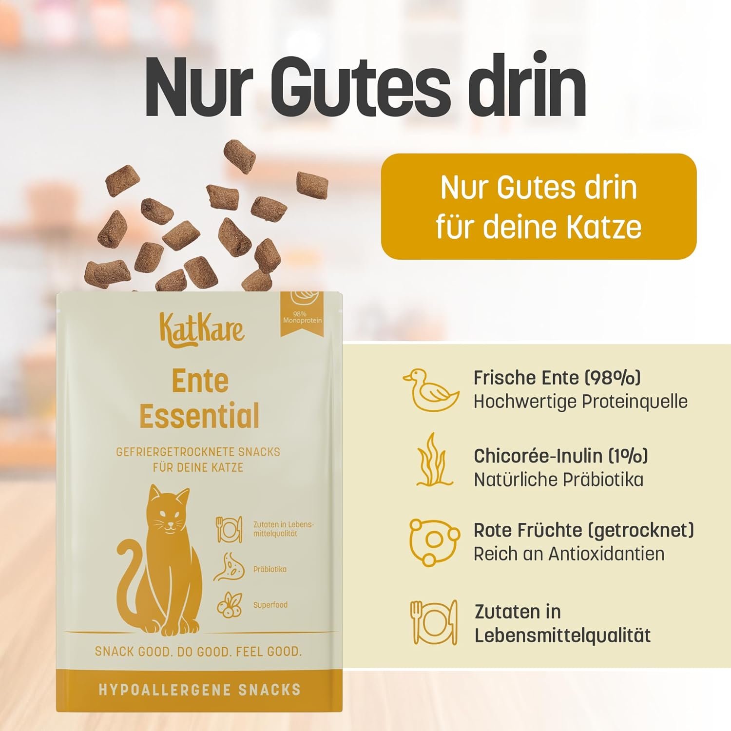Der Appetit ist geweckt – auch wählerische Katzen werden diese Leckerbissen mögen. Sie wirken als natürlicher Appetitanreger, sind schonend verarbeitet und besonders lecker.