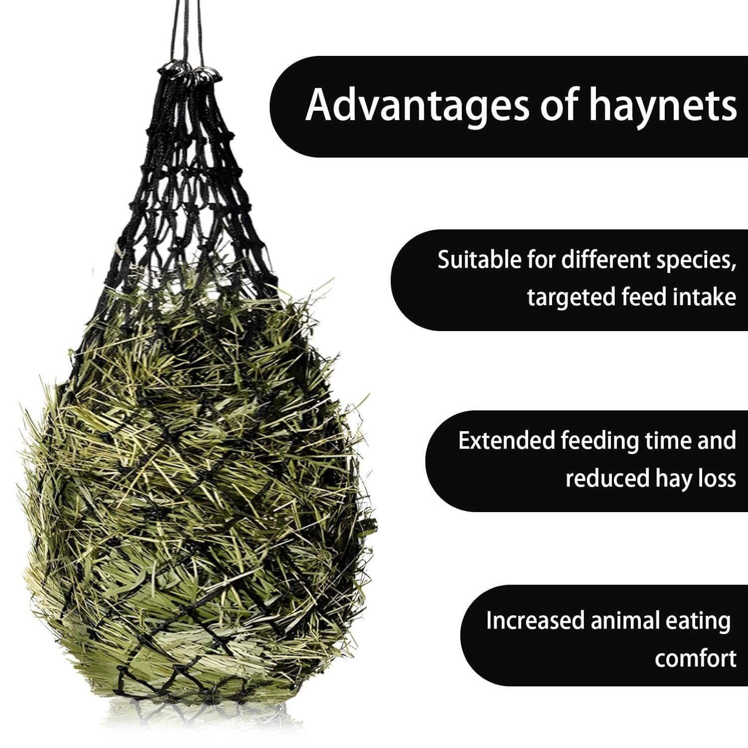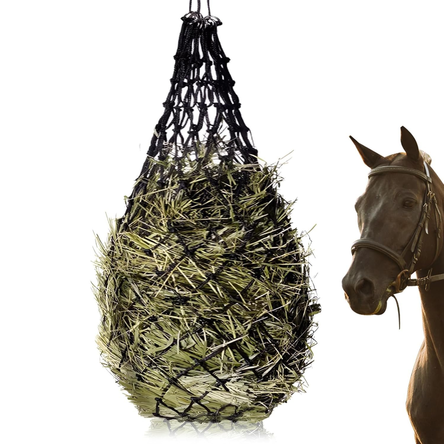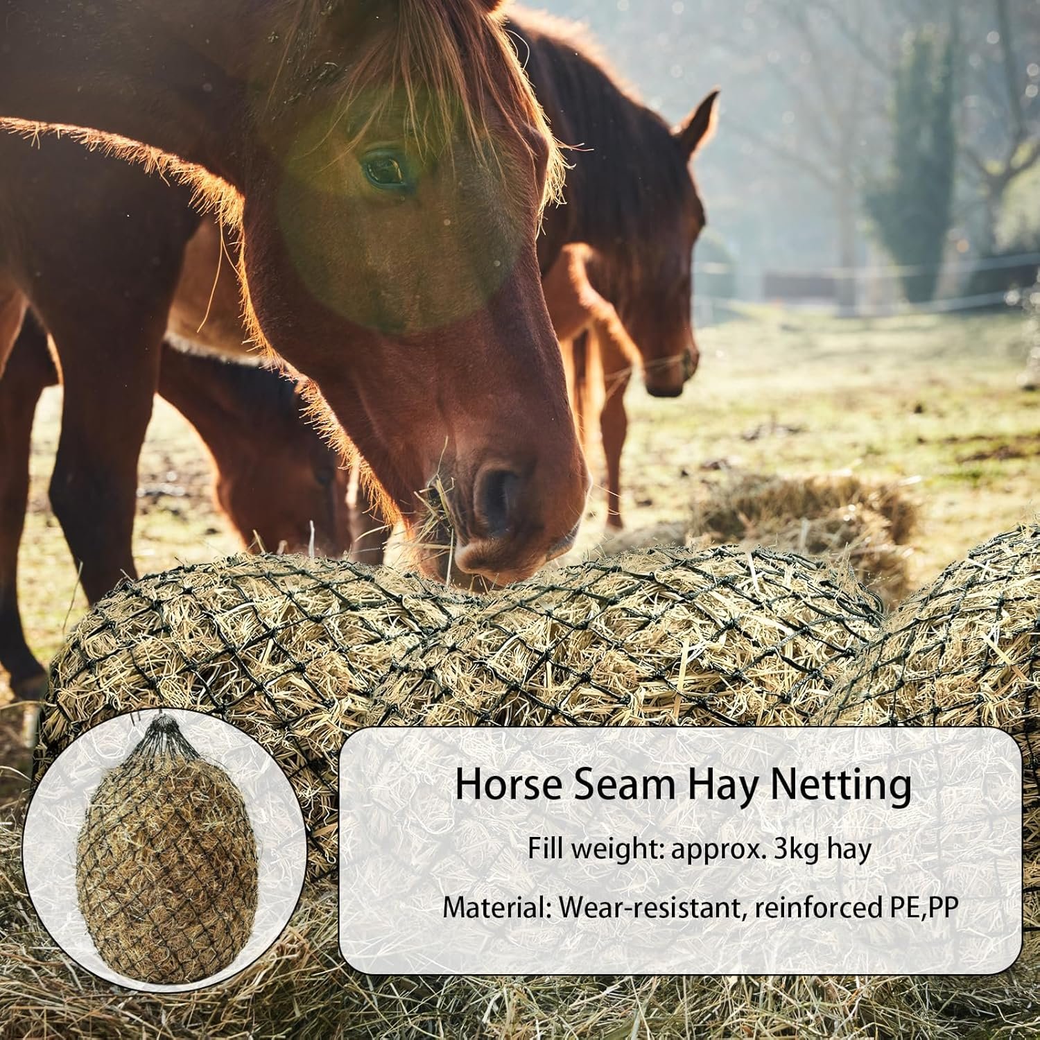 1. Das Heunetz für Pferde besteht aus hochfestem PE-Material und kann mit einem Gewicht von 3 kg gefüllt werden.