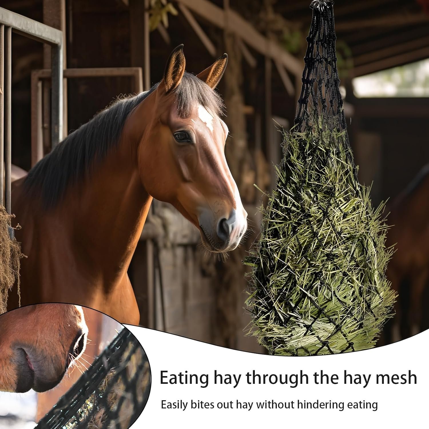 3. Das 5 x 5 cm große Netz sorgt nicht nur dafür, dass das Pferd reibungslos fressen kann, sondern kontrolliert auch die Fressgeschwindigkeit gut.