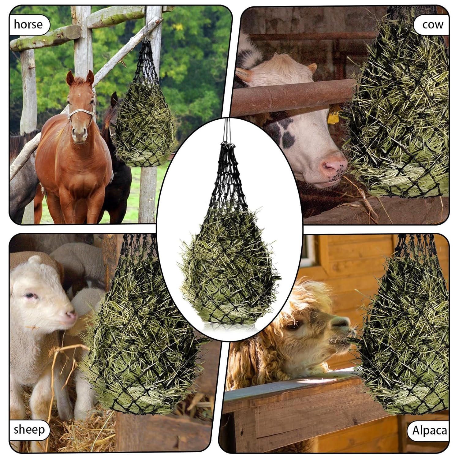 Hochwertige Materialien: Das Heunetz ist aus hochfestem PE-Material gewebt, das verschleißfest und reißfest ist. Die oberen und unteren Öffnungen des Heunetzes sind mit Eisenringen verstärkt, was die Haltbarkeit und Lebensdauer effektiv verbessern kann.