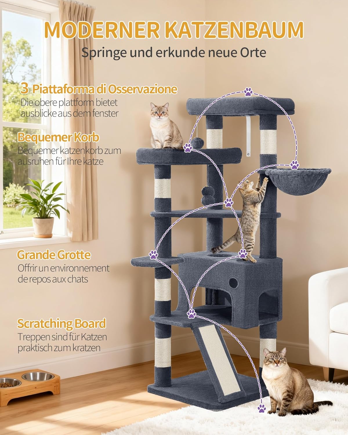 Großes Katzenhaus mit drei Plattformen: Dieser mehrstöckige Kratzbaum bietet viel Platz zum Springen und Spielen, während die geschlossene Höhle einen ruhigen Rückzugsort bietet. Ideal zum Spielen und Schlafen, für Haushalte mit mehreren Katzen